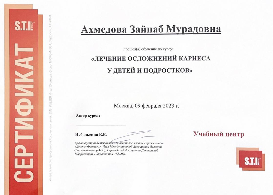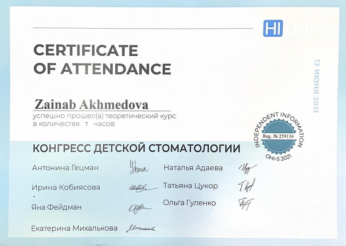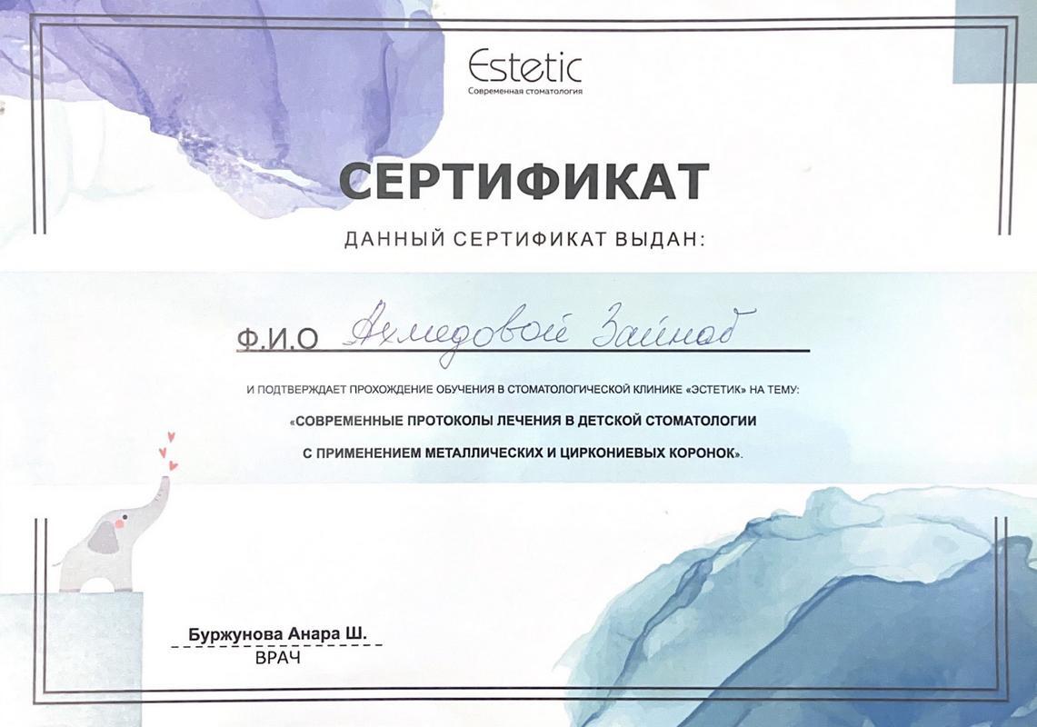 2019г. — Сертификат специалиста, при Федеральном государственном бюджетном образовательном учреждении высшего образования «Московский государственный медико-стоматологический университет имени А.И. Евдокимова» Министерства здравоохранения Российской Федерации, г.Москва, допущена к осуществлению медицинской или фармацевтической деятельности по специальности (направлению подготовки) «Стоматология детская». Сертификат действителен 5 лет;