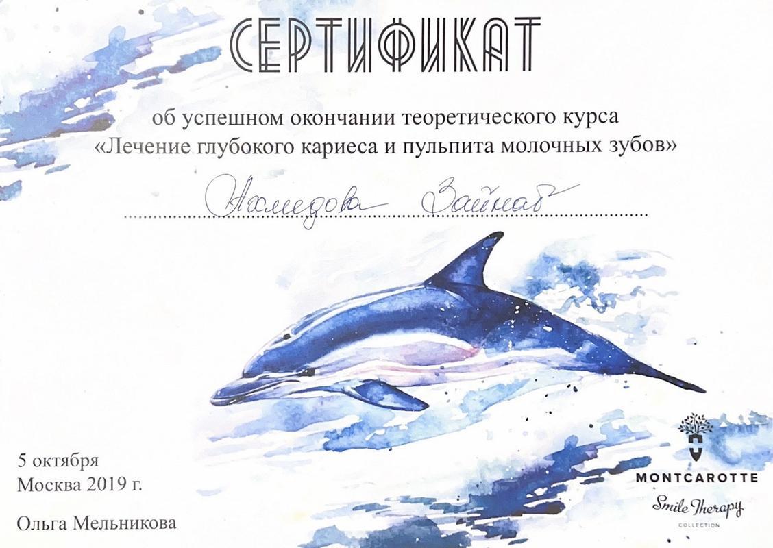 2019г. — Диплом о профессиональной переподготовке, ФГБОУ ВО МГМСУ им. А.И. Евдокимова Минздрава России, г.Москва, диплом предоставляет право на ведение профессиональной деятельности в сфере «Стоматология детская»;