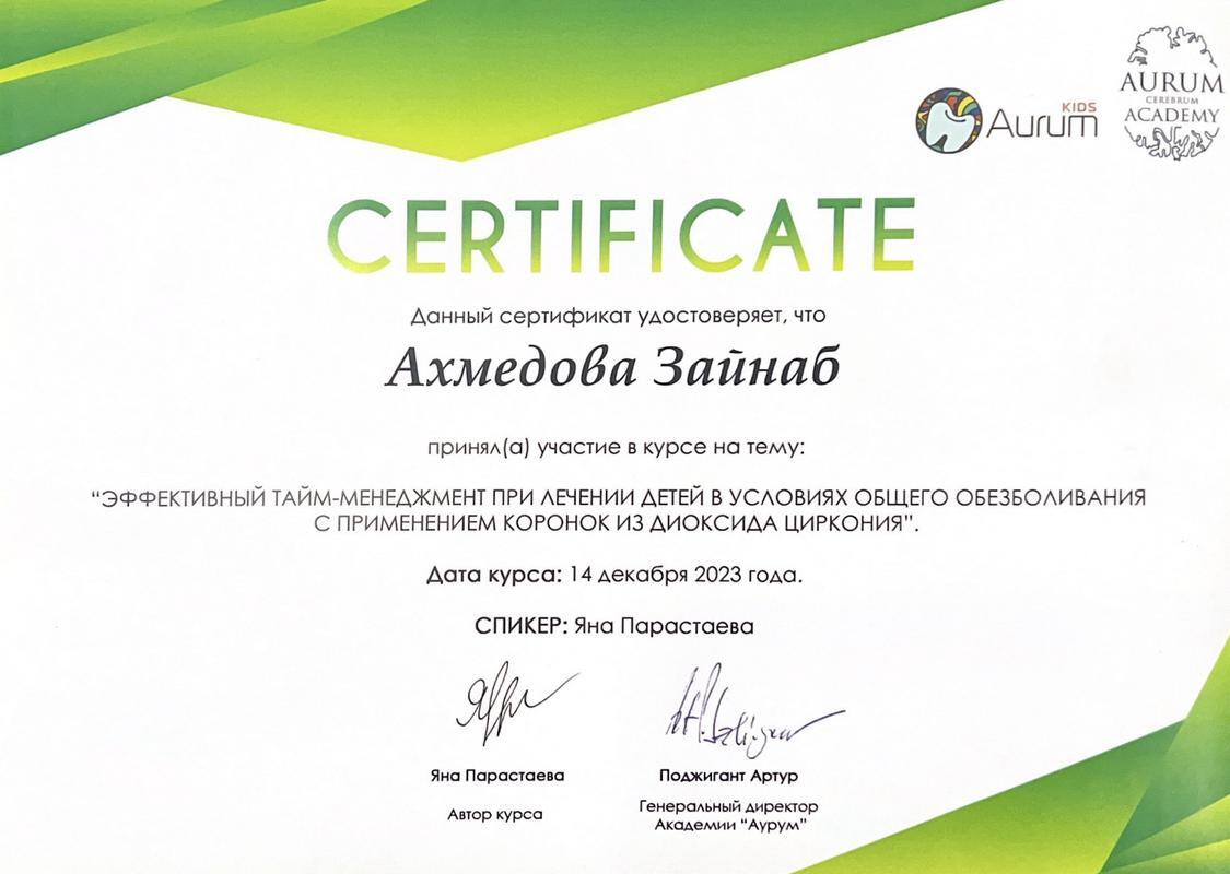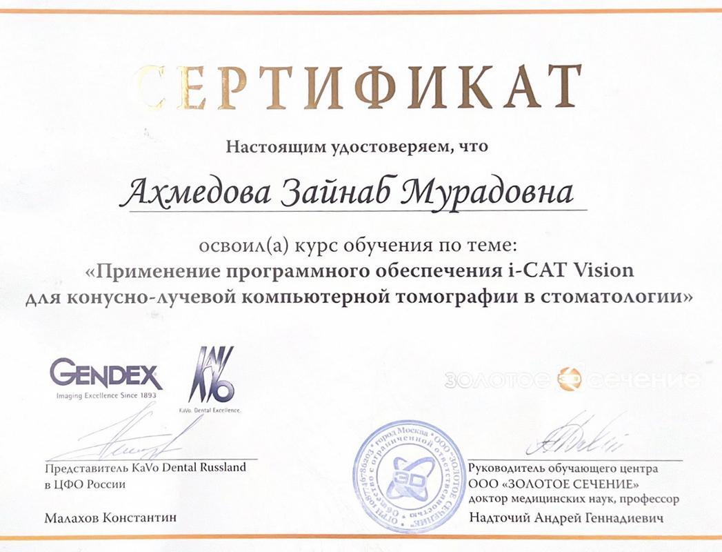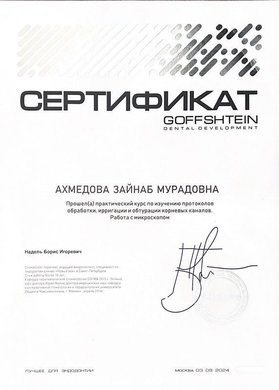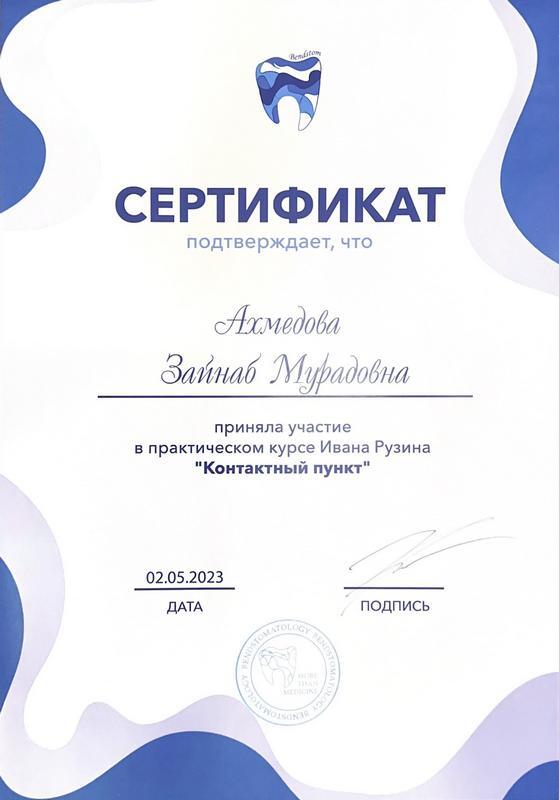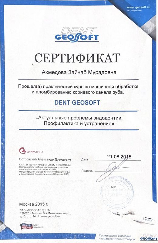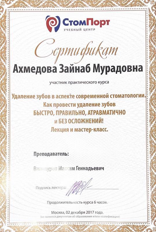 2011г. — Сертификат специалиста, Министерство здравоохранения и социального развития Российской Федерации институт усовершенствования врачей ФГУ «Национальный медико-хирургический центр им. Н.И. Пирогова» Минздравсоцразвития России, г.Москва, присвоена специальность «Стоматология общей практики». Сертификат действителен 5 лет;