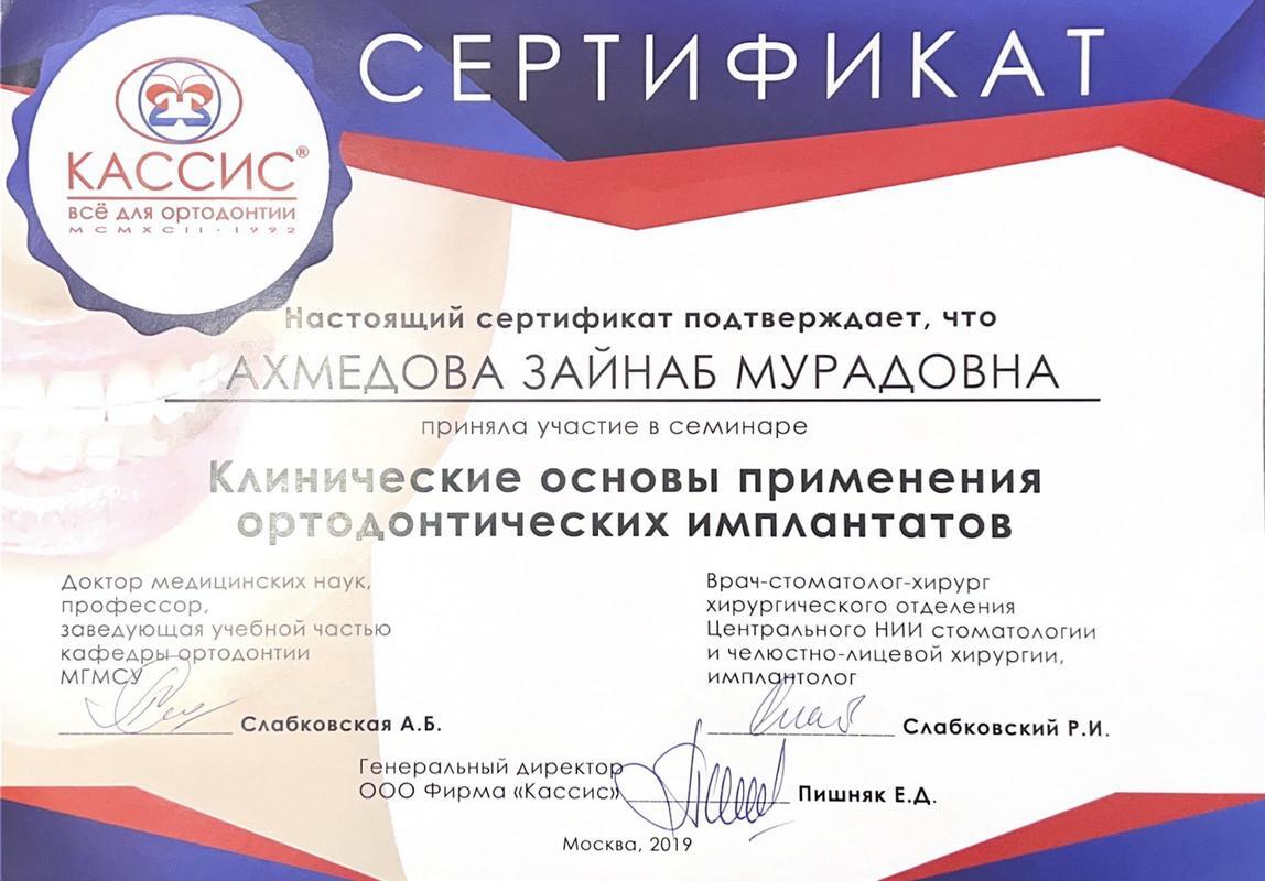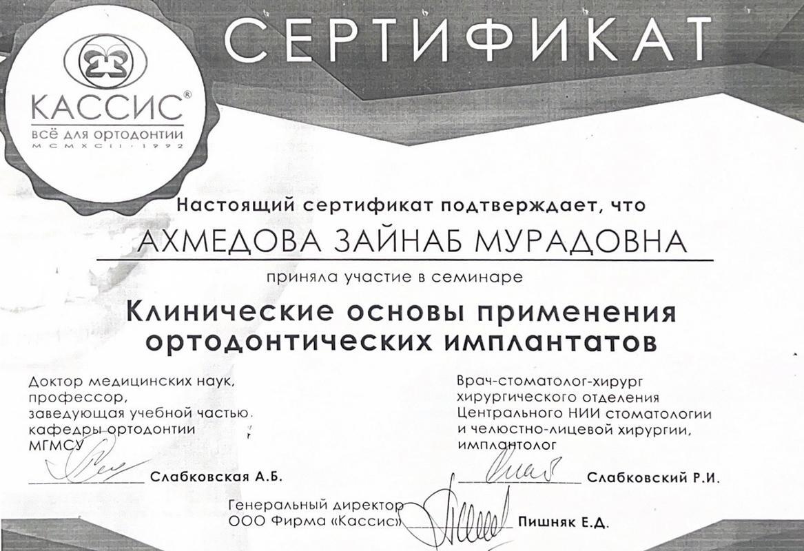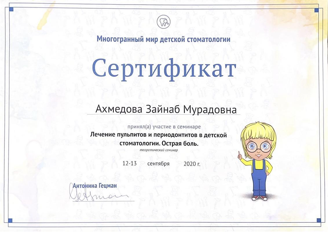 2011г. — Сертификат специалиста, Министерство здравоохранения и социального развития Российской Федерации институт усовершенствования врачей ФГУ «Национальный медико-хирургический центр им. Н.И. Пирогова» Минздравсоцразвития России, г.Москва, присвоена специальность «Стоматология общей практики». Сертификат действителен 5 лет;
