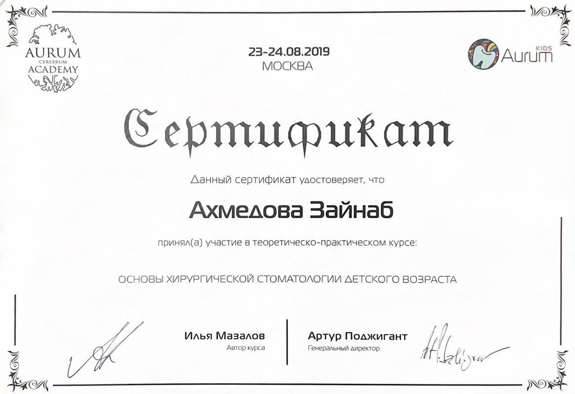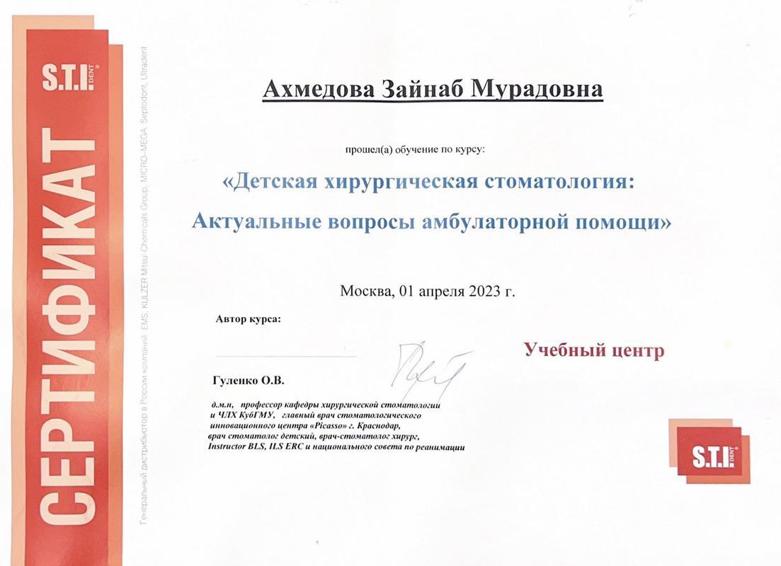 2013г. — Сертификат специалиста, при Институте усовершенствования врачей федерального государственного бюджетного учреждения «Национальный медико-хирургический центр имени Н.И. Пирогова» Министерства здравоохранения Российской Федерации, г.Москва, допущен к осуществлению медицинской или фармацевтической деятельности по специальности «Стоматология хирургическая». Сертификат действителен 5 лет;
