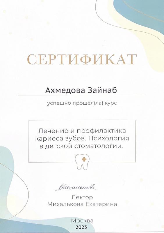 2024г. — Удостоверение о повышении квалификации, Общество с ограниченной ответственностью «Межрегиональный Центр Переподготовки Медицинских кадров»; г.Пенза, по дополнительной профессиональной программе «Стоматология детская»;