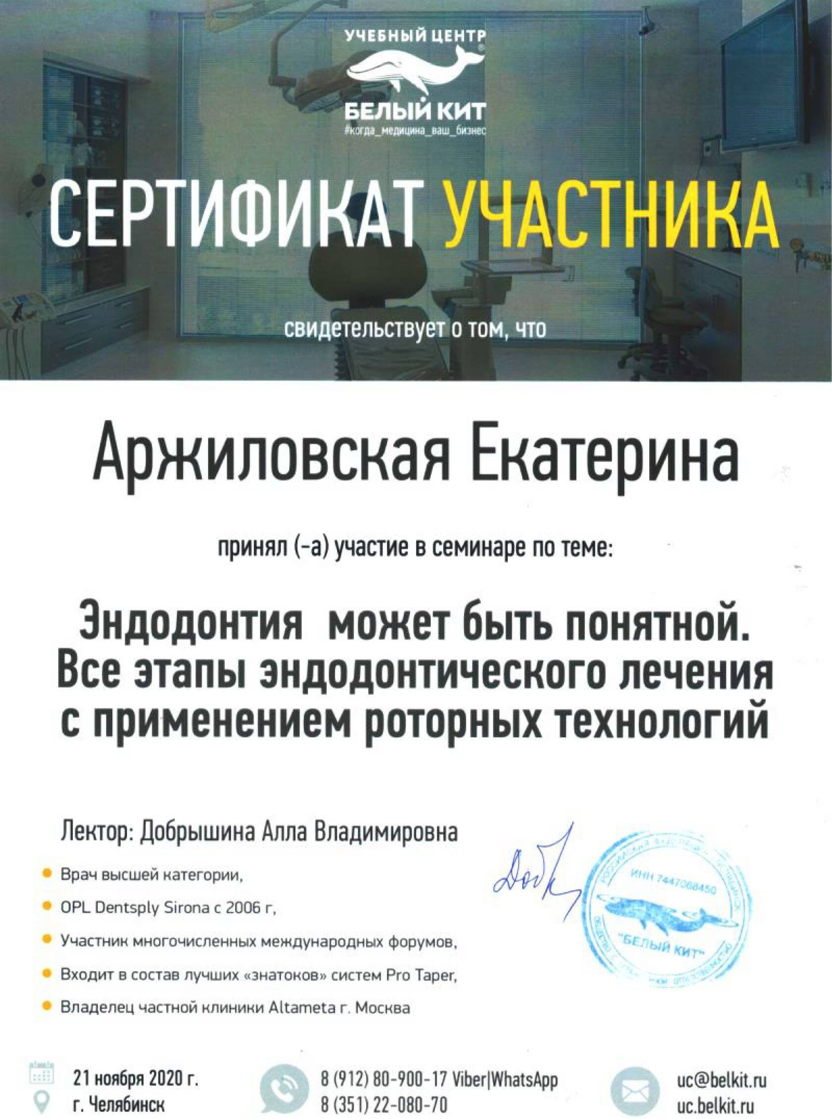 2020г. — Семинар «Эндодотия может быть понятной. Все этапы эндодонтического лечения с применением роторных технологий», А.В. Добрышена, г. Челябинск