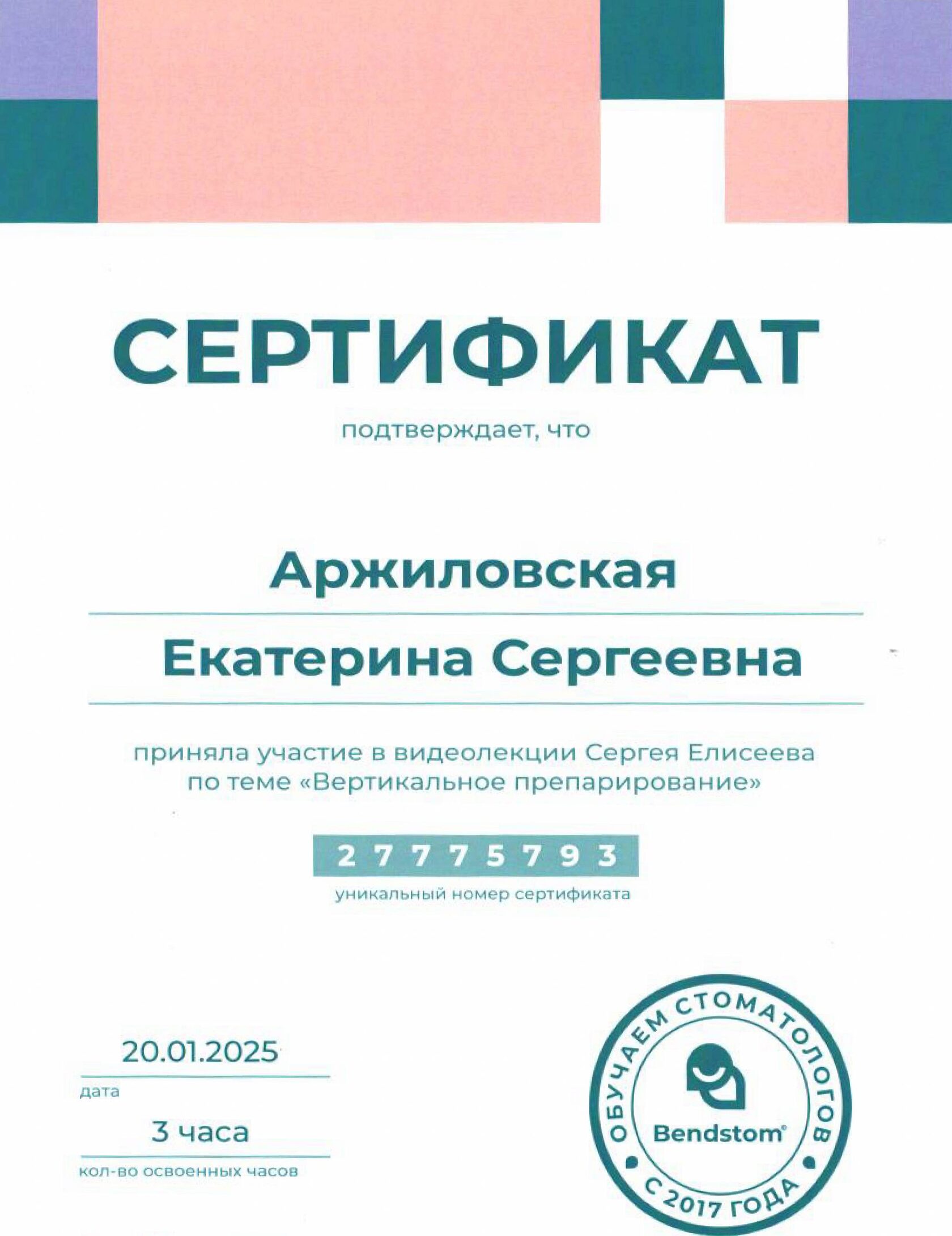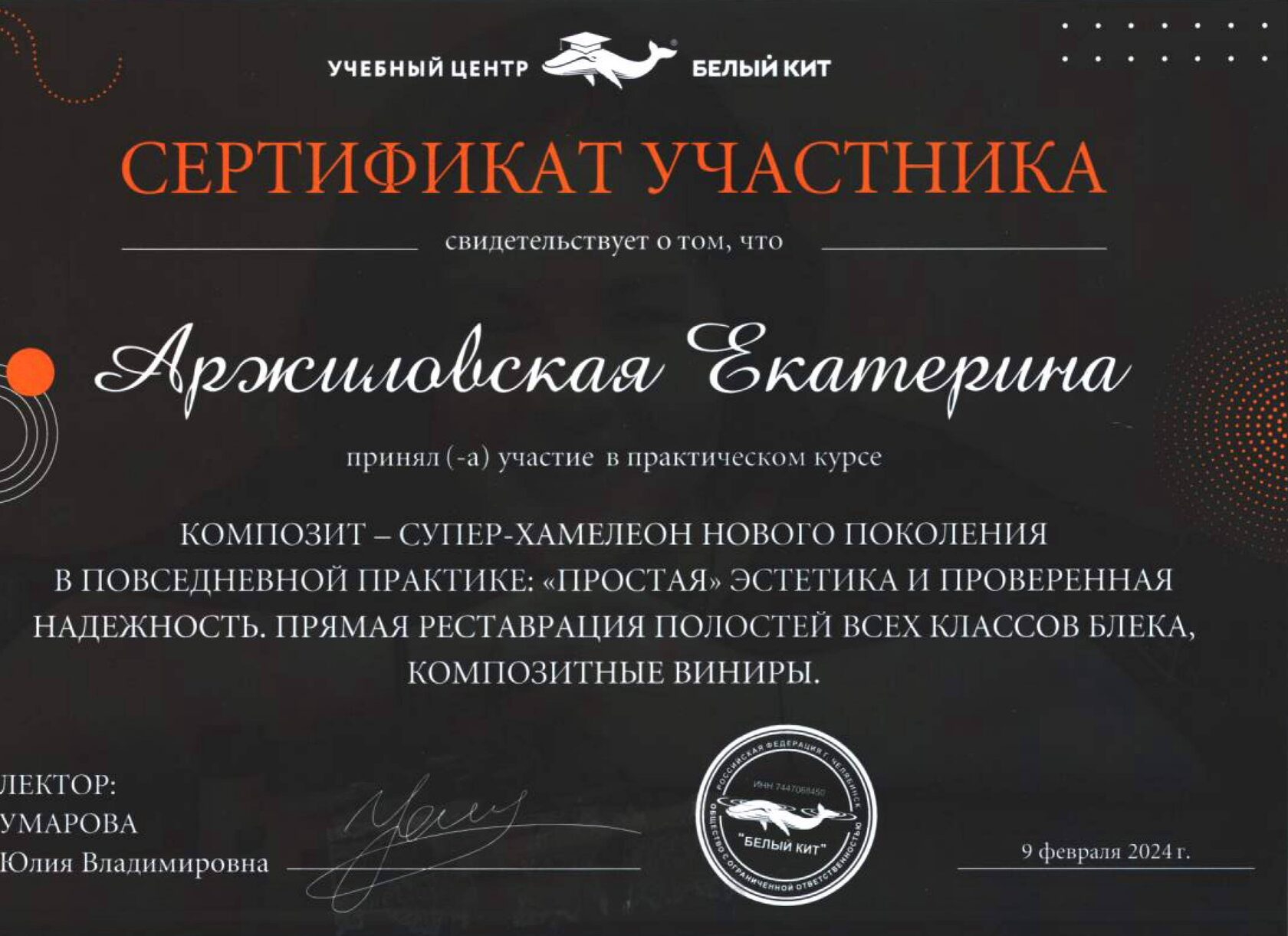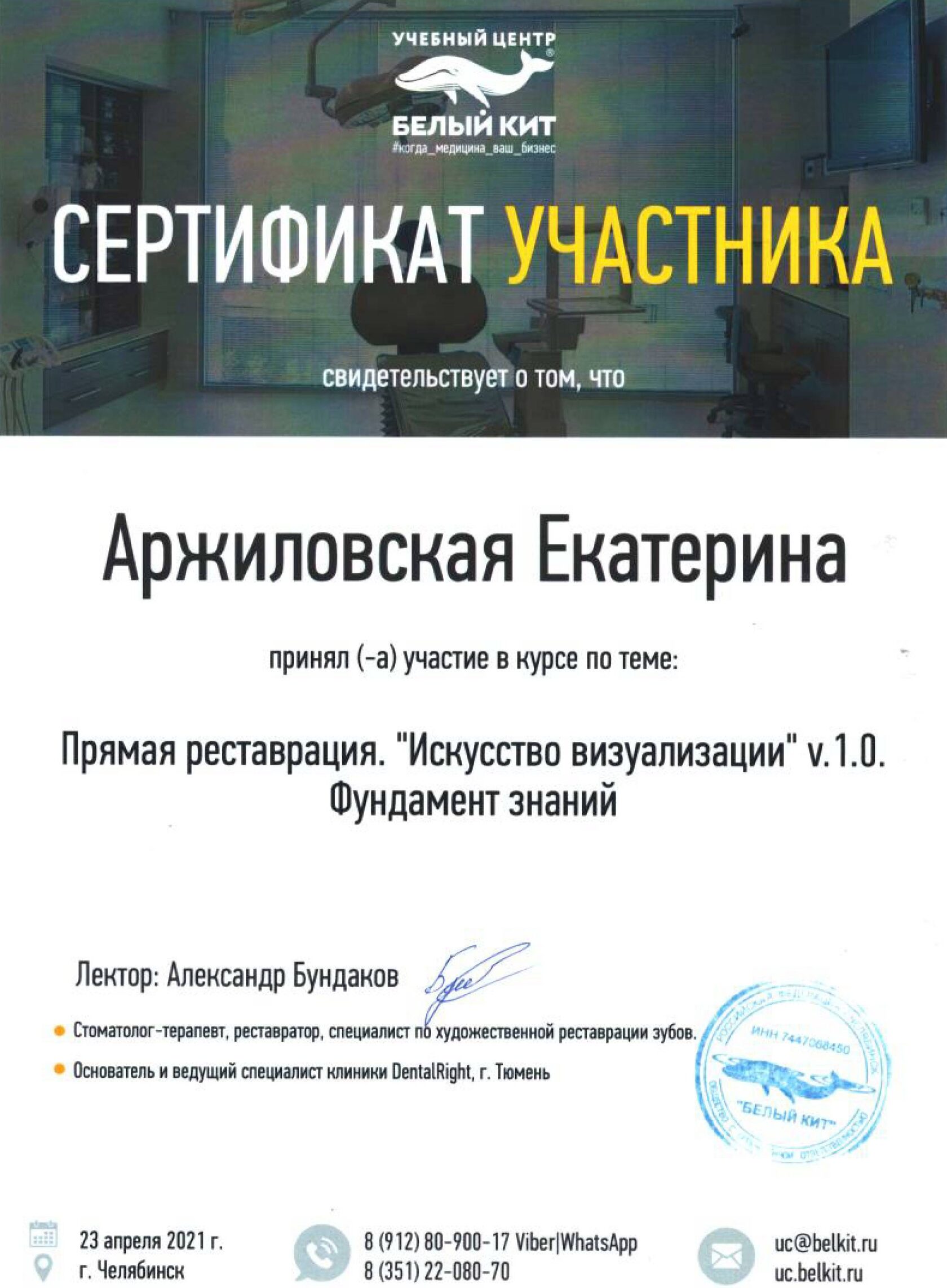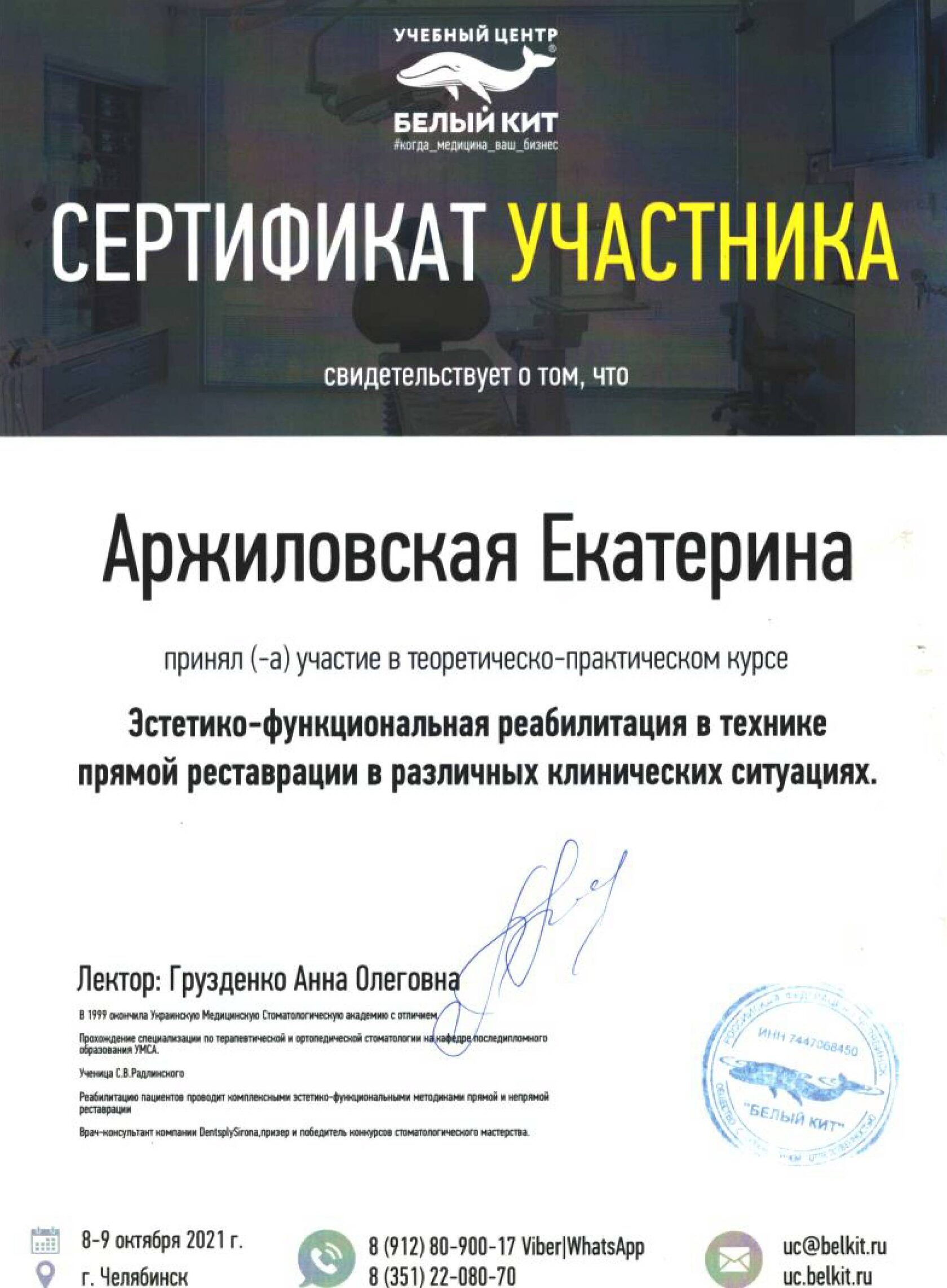 2021г. — «Эстетико-функциональная реабилитация в технике прямой реставрации в различных клинических ситуациях», А.О. Грузденко, Учебный Центр «Белый Кит», г. Челябинск