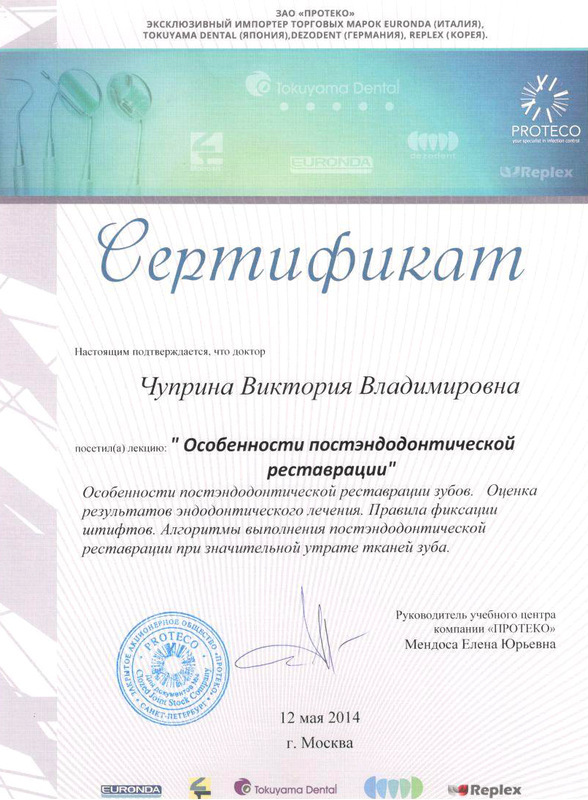 2014г. – Учебный центр «ПРОТЕКО» г. Москва. Сертификат: «Особенности постэндодонтической реставрации. Правила и алгоритмы выполнения»