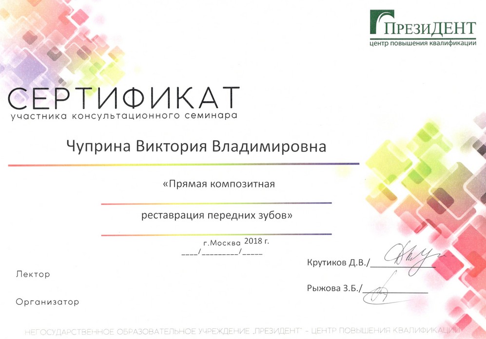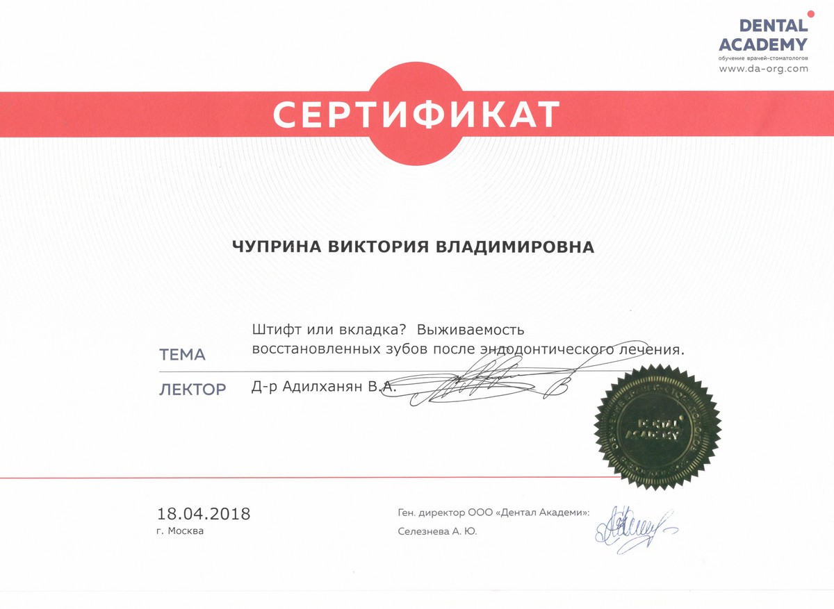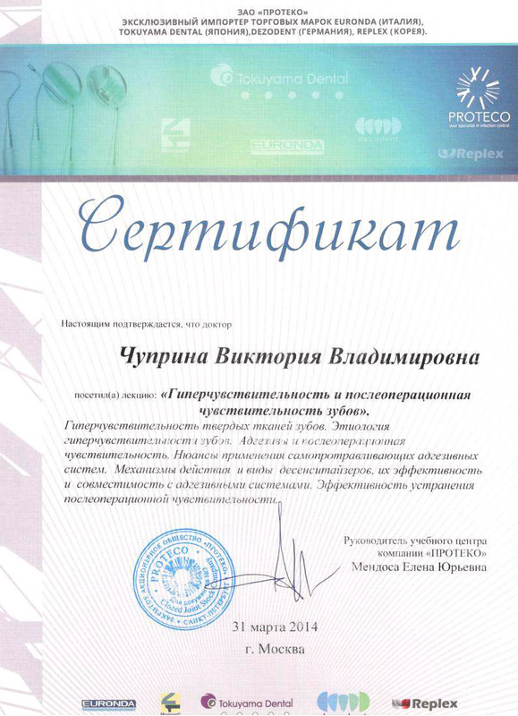 2014г. – Сертификат. Учебный центр «ПРОТЕКО» г. Москва: «Гиперчувствительность и послеоперационная чувствительность зубов. Механизмы действия и виды десенситайзеров, нюансы применения самопротравливающих адгезивных систем»