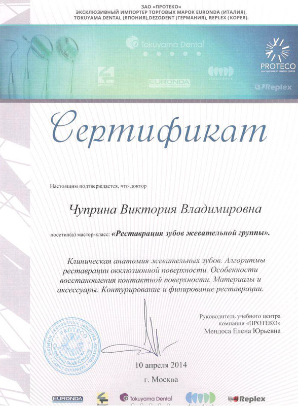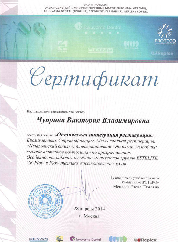 2014г. – Сертификат. Учебный центр «ПРОТЕКО» г. Москва: мастер — класс: «Реставрация зубов фронтальной группы». Мастер-класс «Реставрация зубов жевательной группы». Estelite. Tokuyama Dental (Япония)