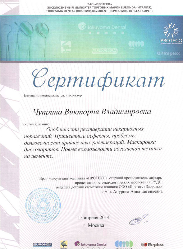 2014г. – Учебный центр «ПРОТЕКО» г. Москва. Сертификат: «Особенности реставрации некариозных поражений. Пришеечные дефекты. Маскировка дисколоритов»