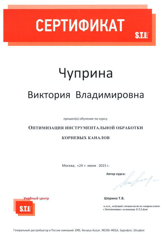2015г. – Учебный центр «S.T. I. Dent» г. Москва. Сертификат:«Оптимизация инструментальной обработки корневых каналов»