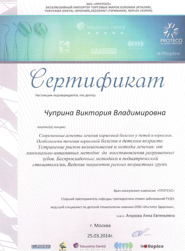 2014г. – Сертификат «Современные аспекты лечения кариозной болезни у детей и взрослых. Особенности течения кариозной болезни в детском возрасте. Устранение рисков возникновения и методы лечения: от минимального-инвазивных методик в педиатрической стоматологии. Ведение пациентов разных возрастных групп», г. Москва