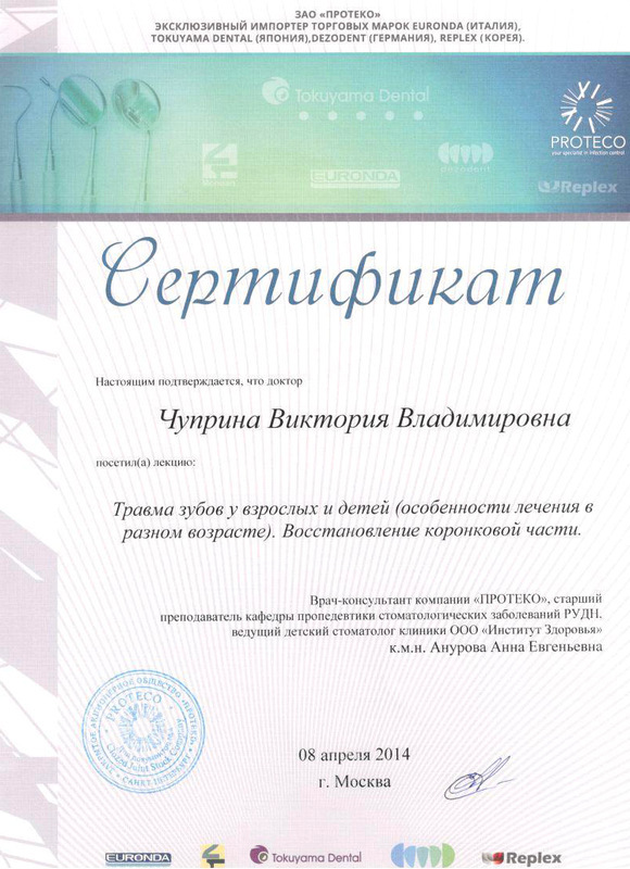 2014г. – Сертификат. Учебный центр «ПРОТЕКО» г. Москва: «Травма зубов у взрослых и детей (особенности лечения в разном возрасте). Восстановление коронковой части