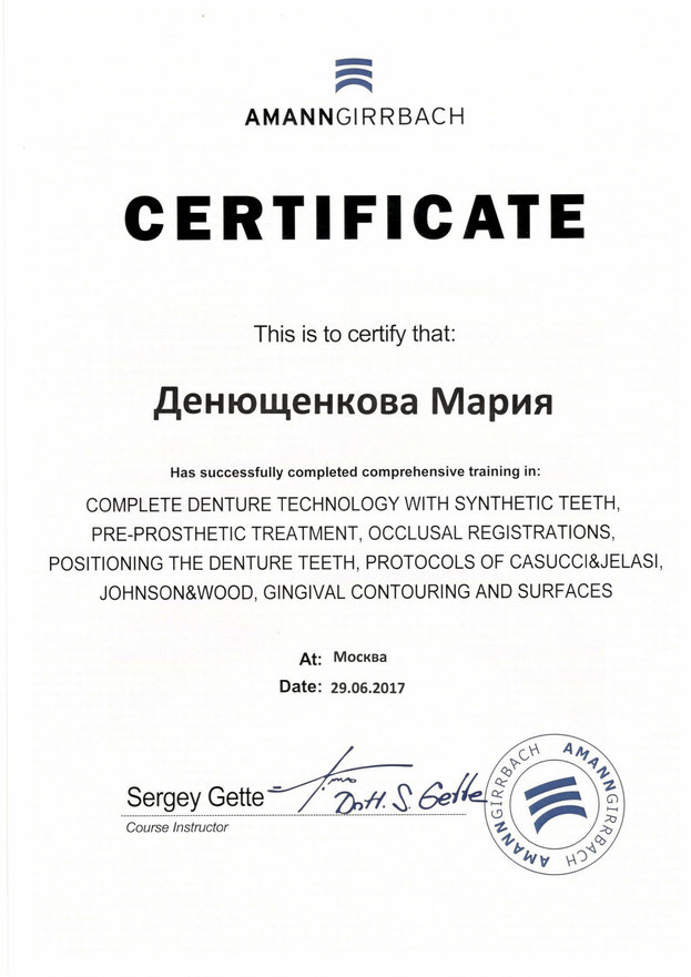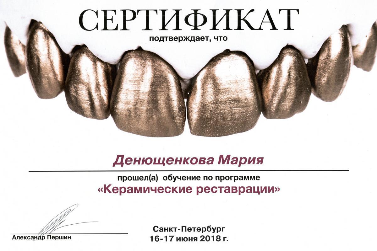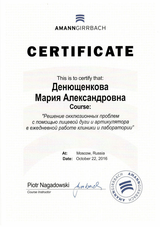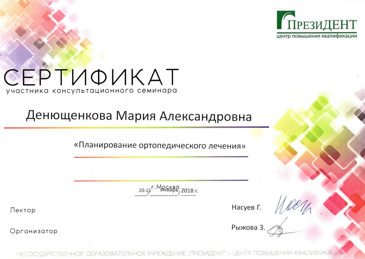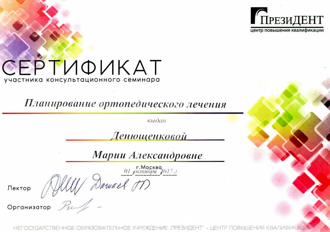 • 2018г. — Сертификат специалиста по специальности «Стоматология ортопедическая» АНО ДПО АИСт, г.Москва.
