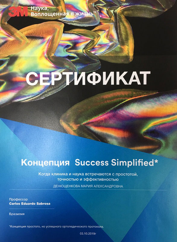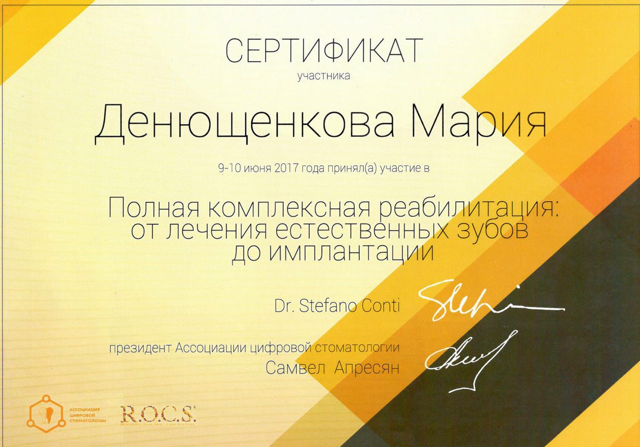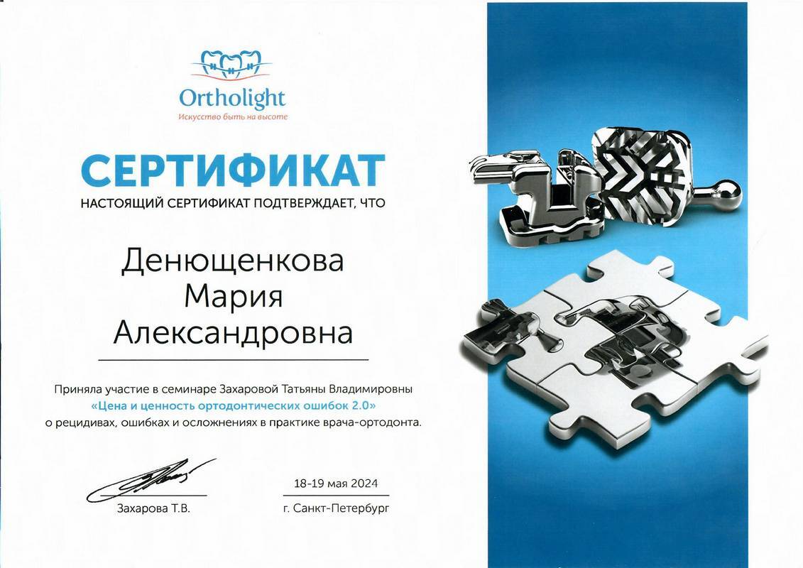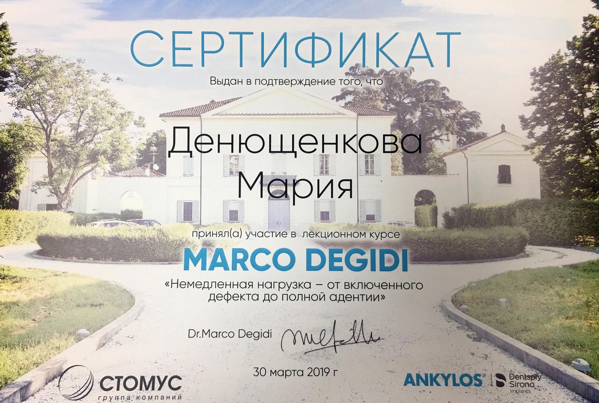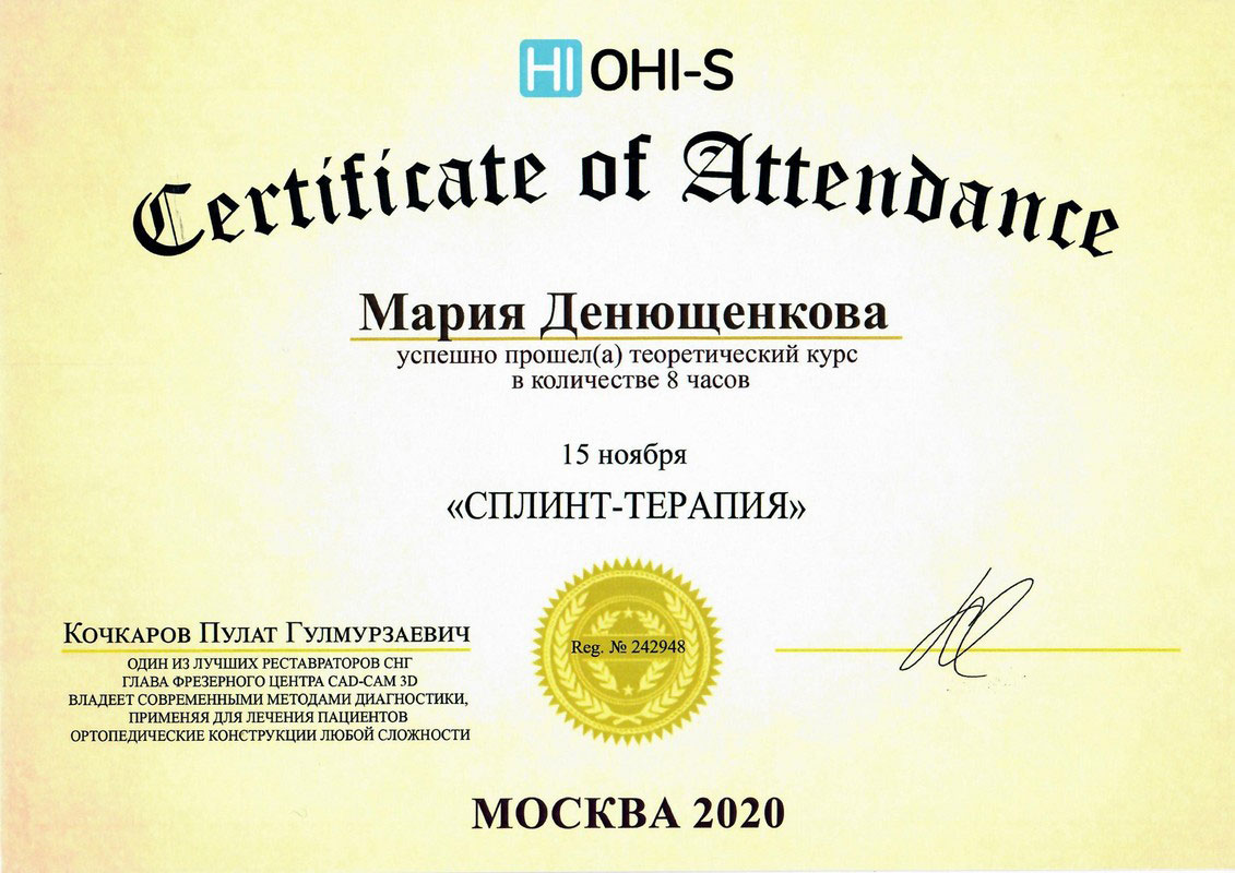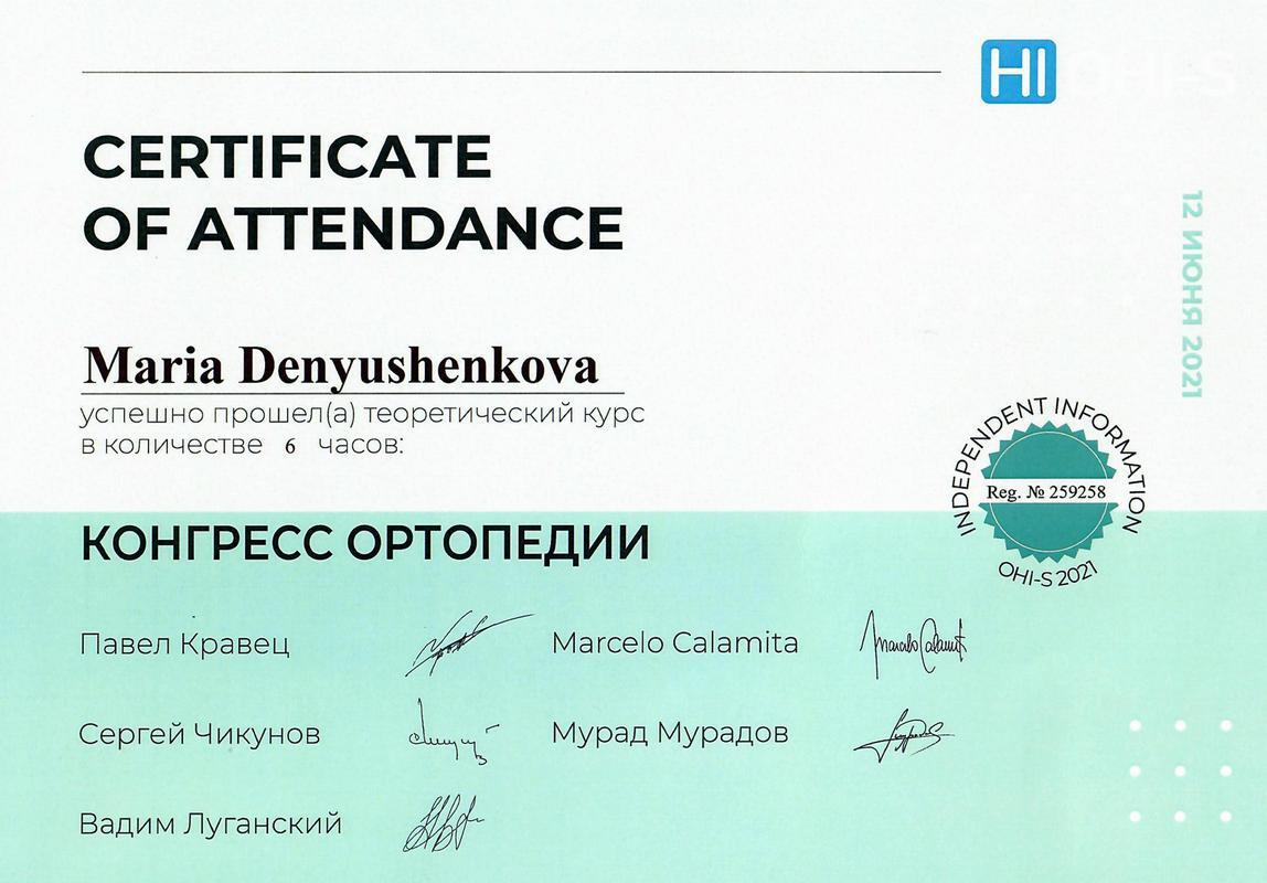 • 2018г. — Сертификат специалиста по специальности «Стоматология ортопедическая» АНО ДПО АИСт, г.Москва.