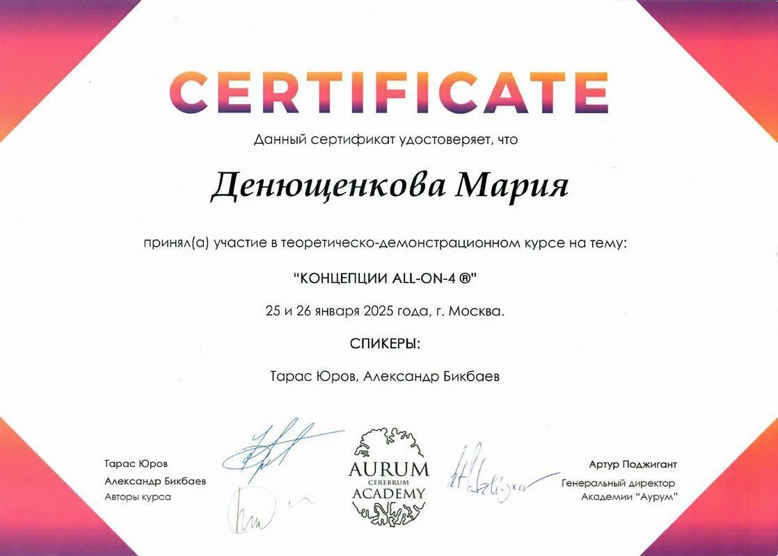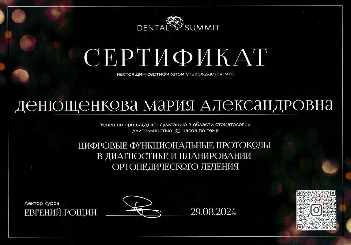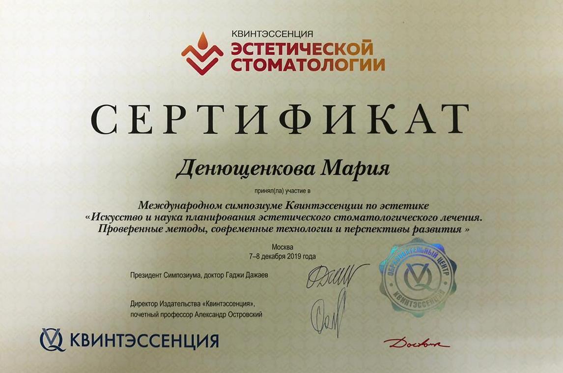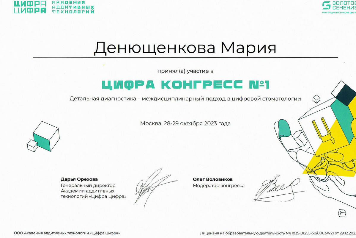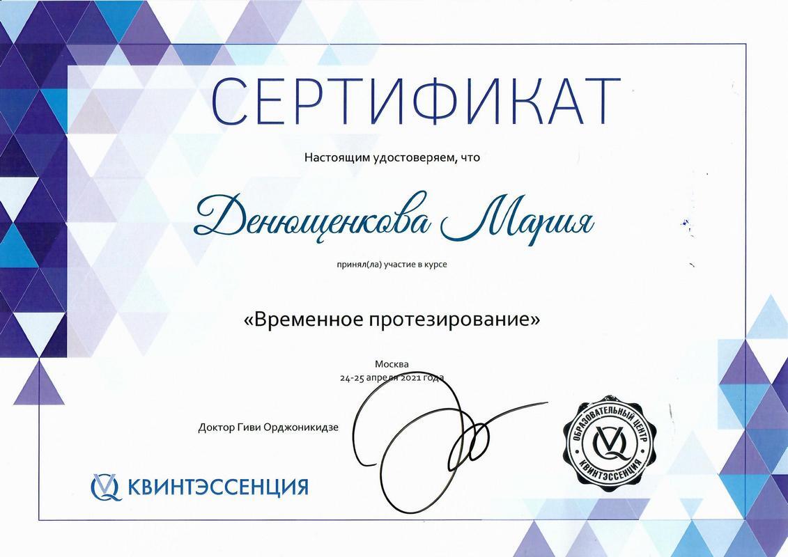 • 2018г. — Сертификат специалиста по специальности «Стоматология ортопедическая» АНО ДПО АИСт, г.Москва.