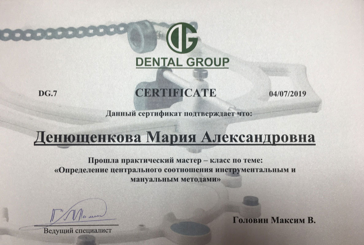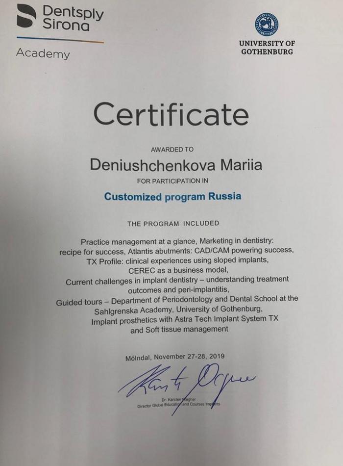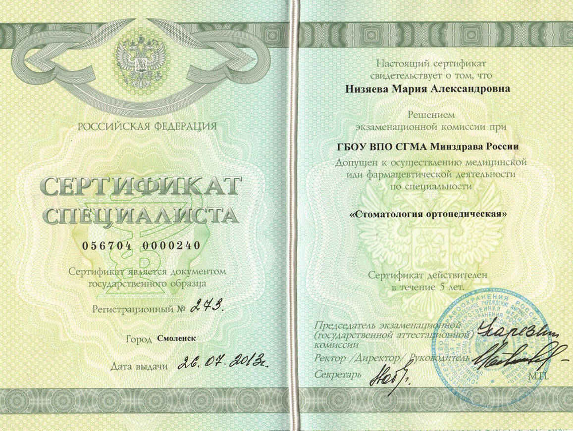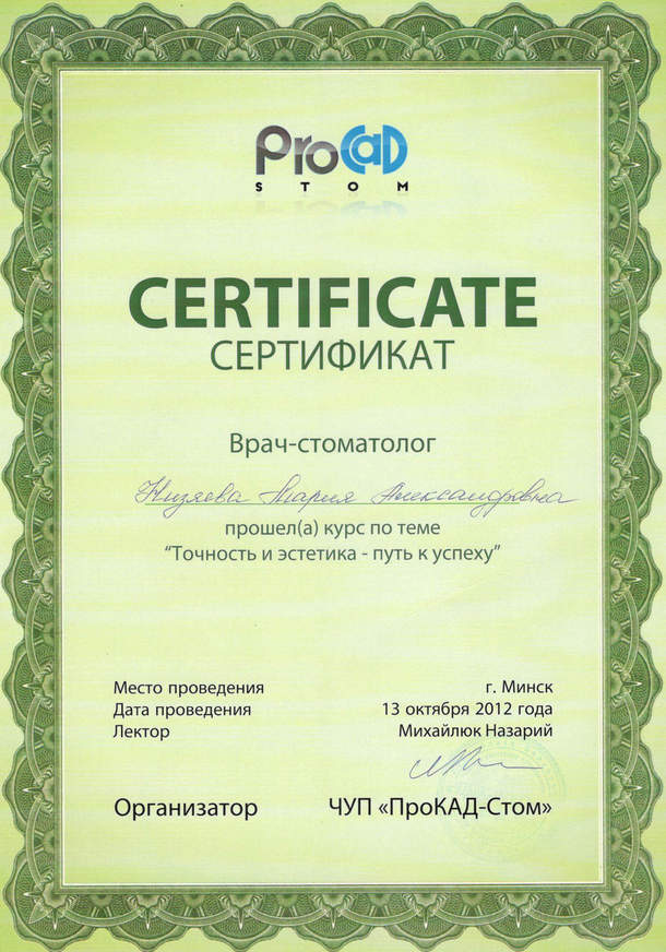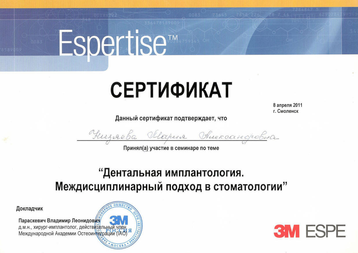 • 2011г. — Сертификат по специальности «Стоматология общей практики», ГОУ ВПО «Смоленская Государственная Медицинская Академия», г.Смоленск.