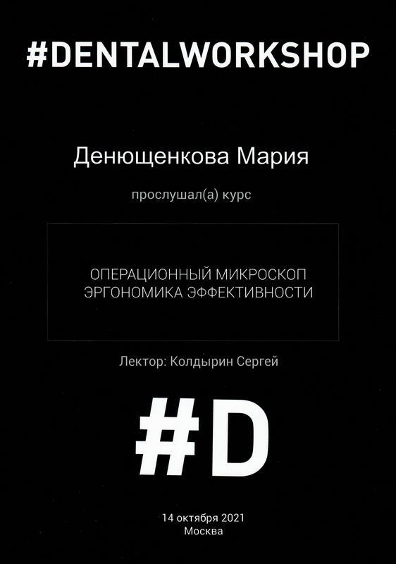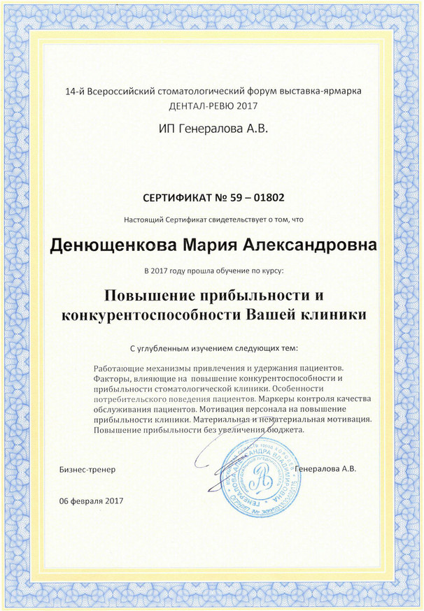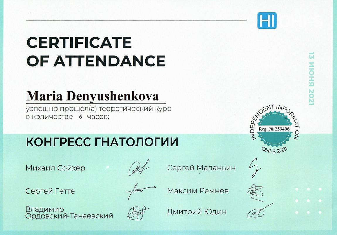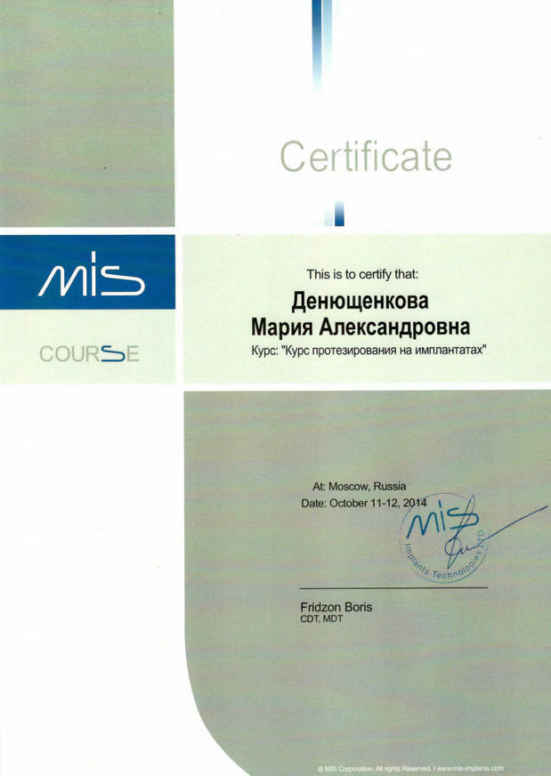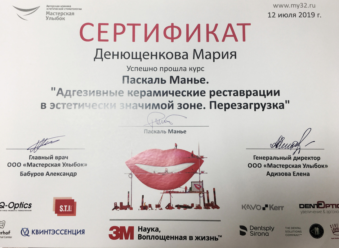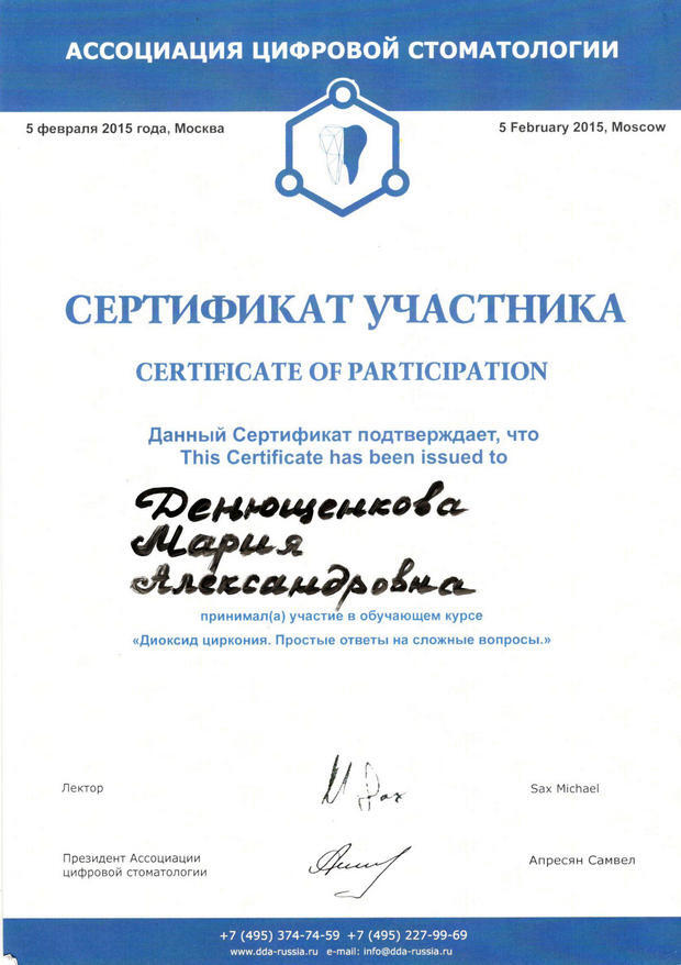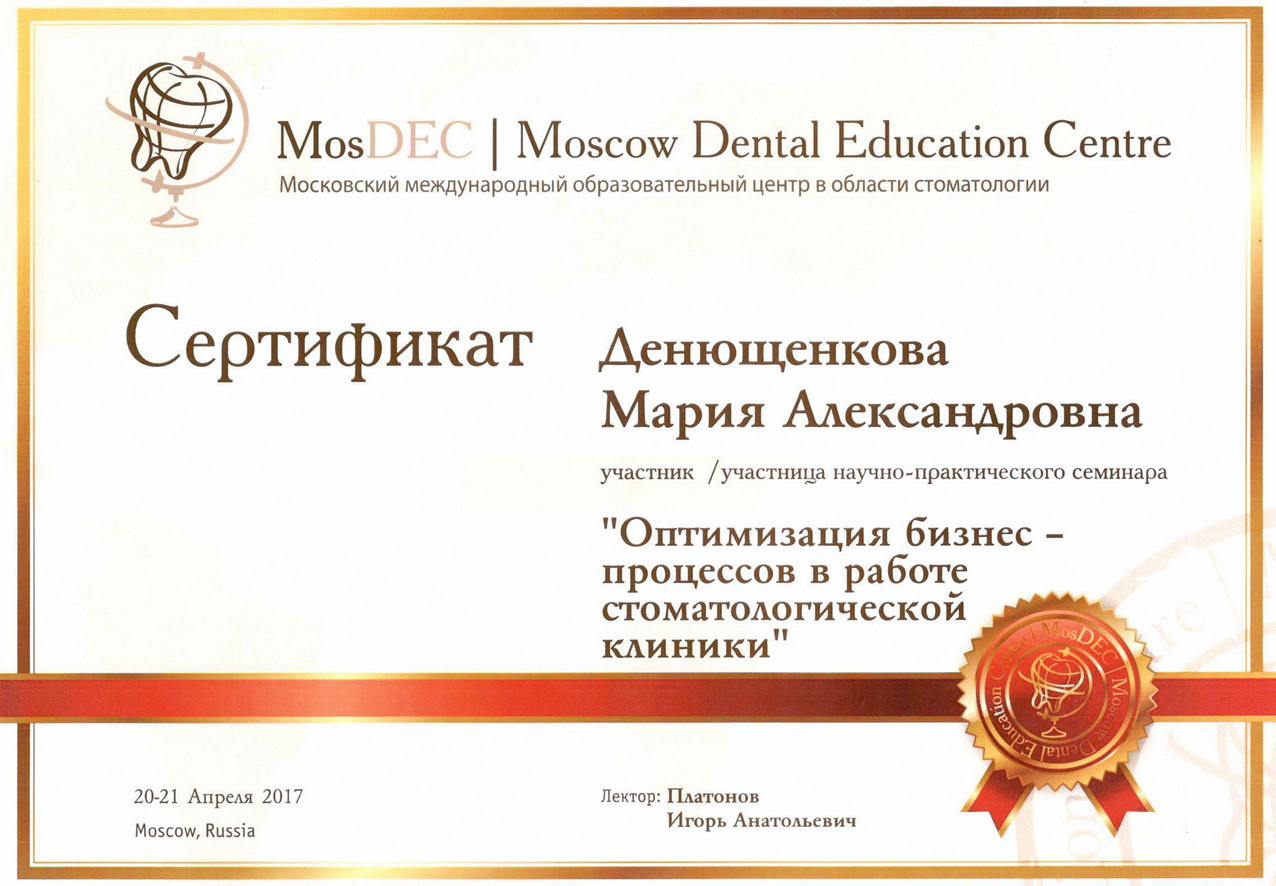 • 2011г. — Сертификат по специальности «Стоматология общей практики», ГОУ ВПО «Смоленская Государственная Медицинская Академия», г.Смоленск.