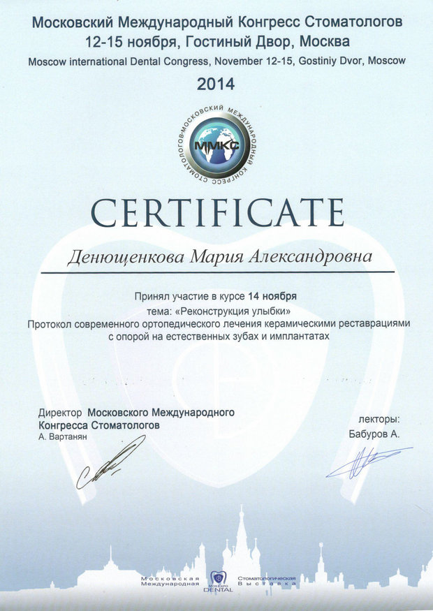 • 2014г. — семинар «Реконструкция улыбки» Протокол современного ортопедического лечения керамическими реставрациями с опорой на естественных зубах и имплантатах. Лектор: Бабуров А.