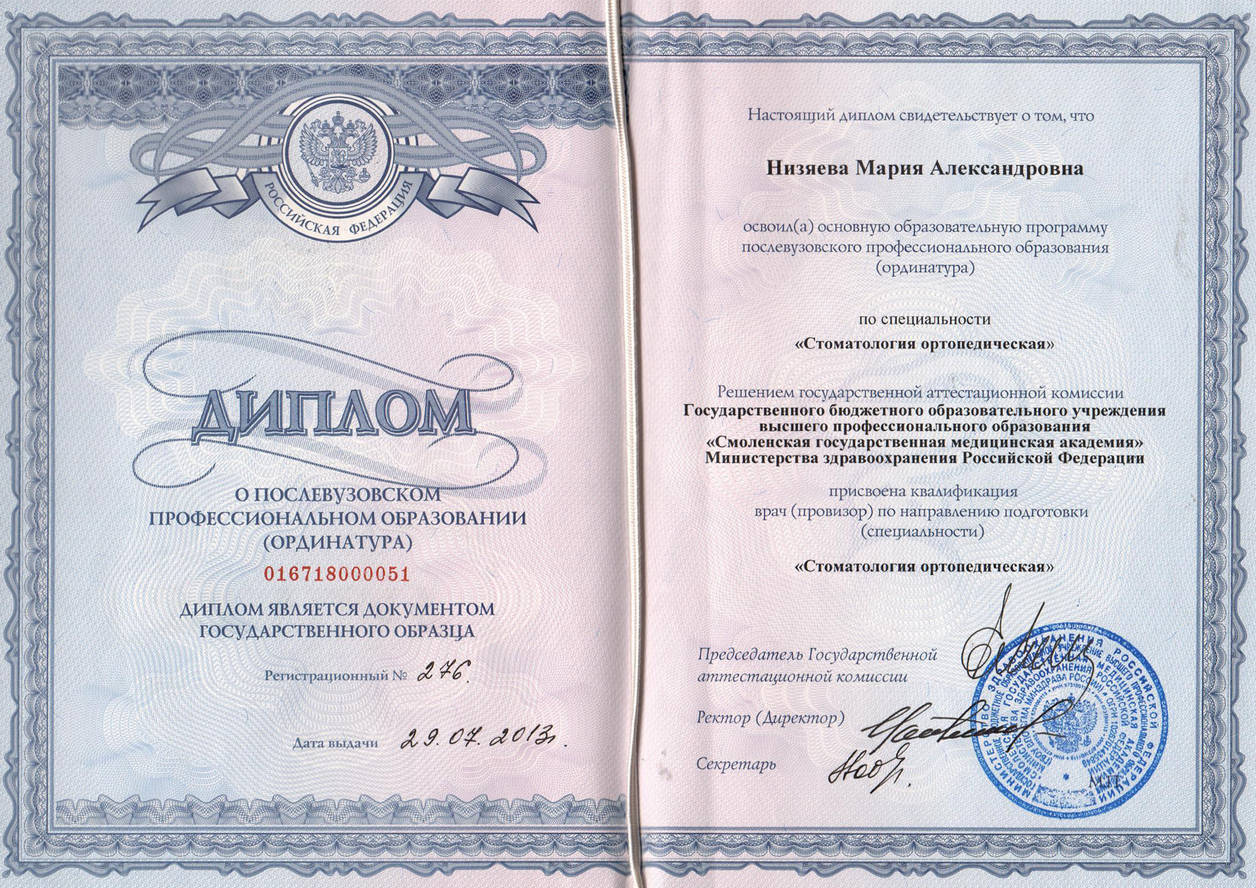 • 2005–2010гг. — Диплом с отличием по специальности «Стоматология». Смоленская Государственная Медицинская Академия, г.Смоленск.