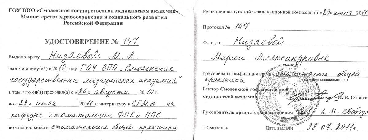 • 2011г. — Удостоверение об окончании интернатуры по специальности «Стоматология общей практики» ГОУ ВПО «Смоленская Государственная Медицинская Академии» г.Смоленск.