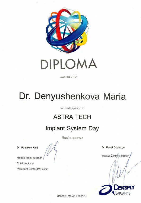 • 2015г. — семинар «Протезирование на имплантатах ASTRA TECH»