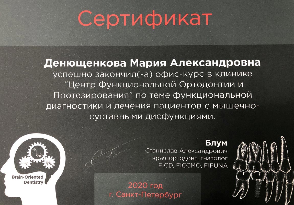 • 2020г. — центр функциональной ортодонтии и протезирования по теме функциональной диагностики и лечения пациентов с мышечно-суставными дисфункциями.