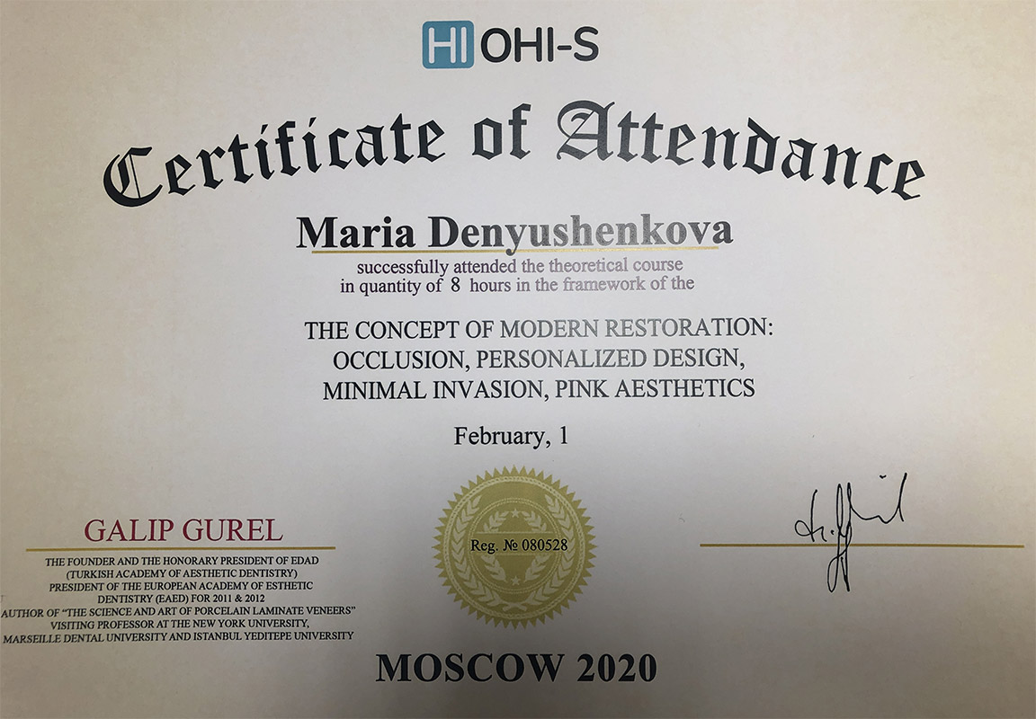 • 2020г. — The Concept of Modern Restoration: occlusion, personalized design, minimal invasion, pink aesthetics