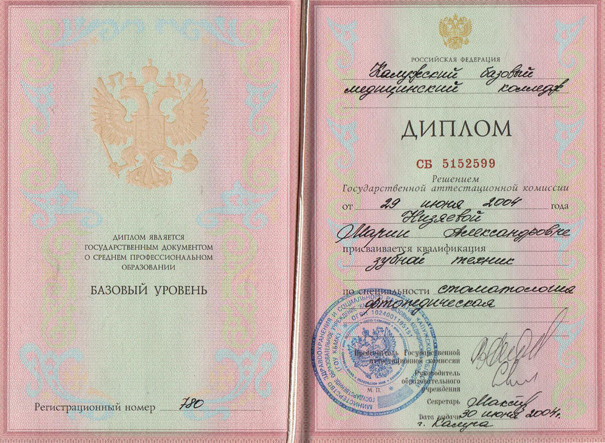 • 2001–2004гг. — Диплом по специальности «Зубной техник». Калужский базовый Медицинский колледж, г.Калуга.