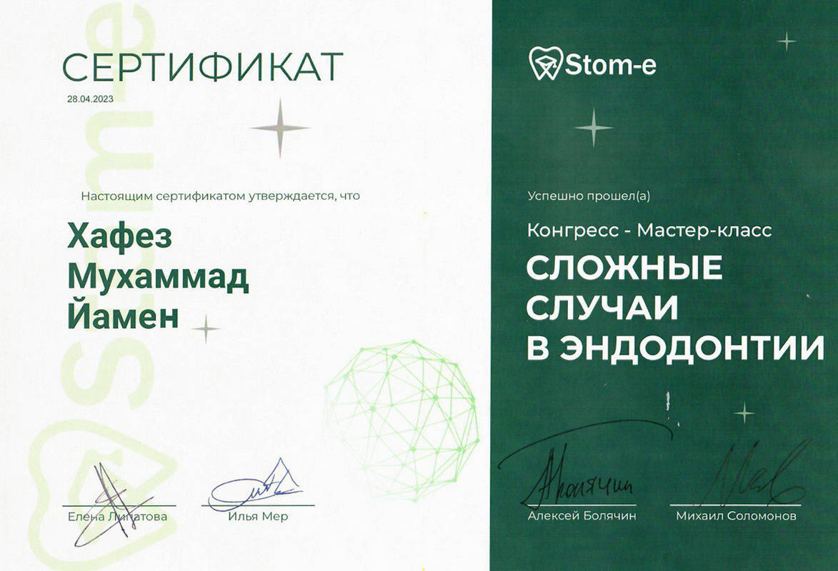 2021г. – Диплом по специальности «Стоматология терапевтическая», Российский университет дружбы народов
