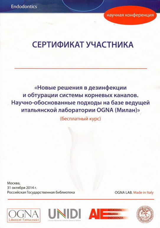 2014 г. — Участвовала в научной конференции «Новые решения в дезинфекции системы корневых каналов. Научно—обоснованные подходы на базе ведущей итальянской лаборатории OGNA (Милан)»
