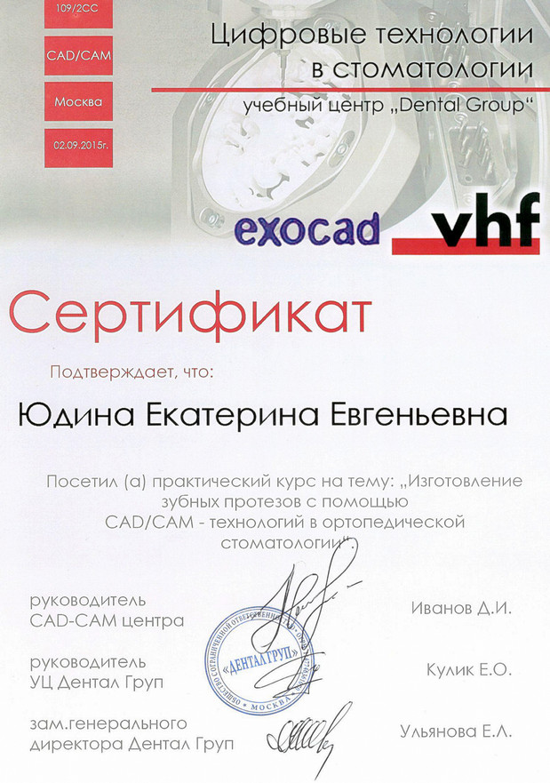 2015 г. — Учебный центр «Dental Group». Цифровые технологии в стоматологии. Посетила практический курс на тему: «Изготовление зубных протезов с помощью CAD/CAM—технологий в ортопедической стоматологии.»