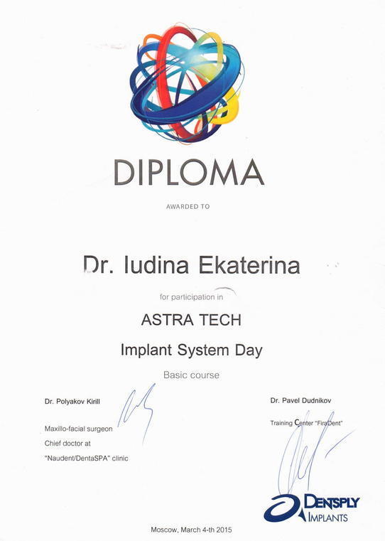 2015 г. — Прошла базовый курс по имплантации «ASTRA—TECH Implant Sistem Day Basic course» Dr.Pavel Dudnikov