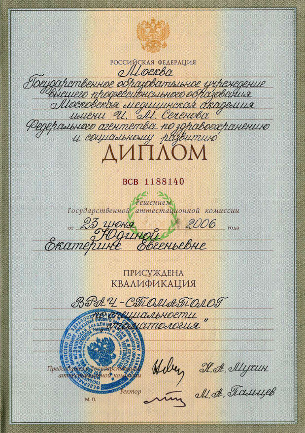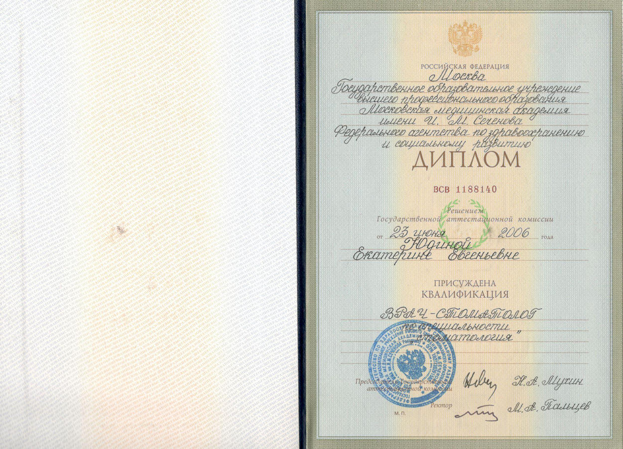 2006г. — Диплом по специальности «Стоматология», ГОУ высшего профессионального образования Московская Медицинская Академии им. И.М. Сеченова, г.Москва;