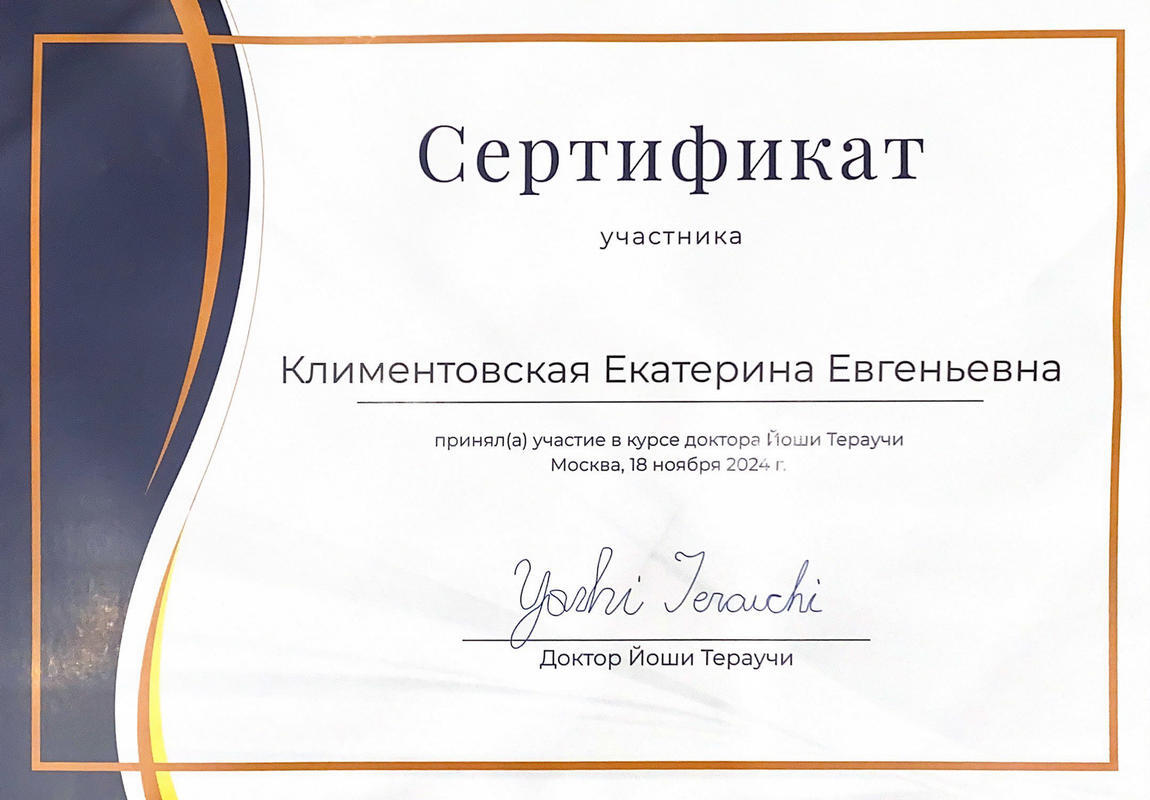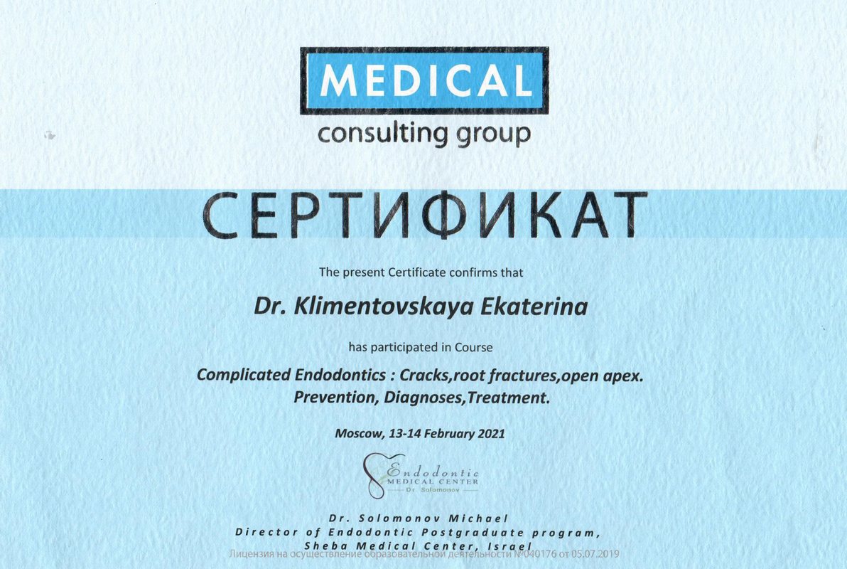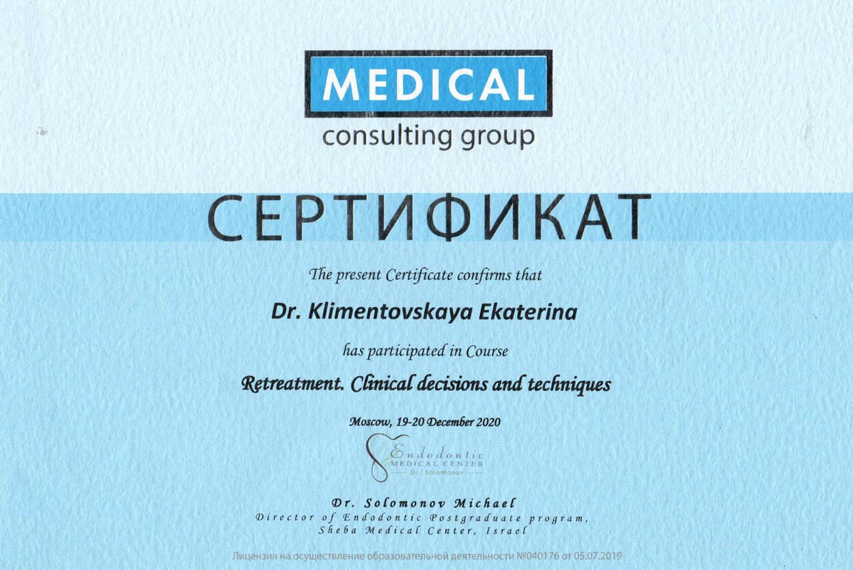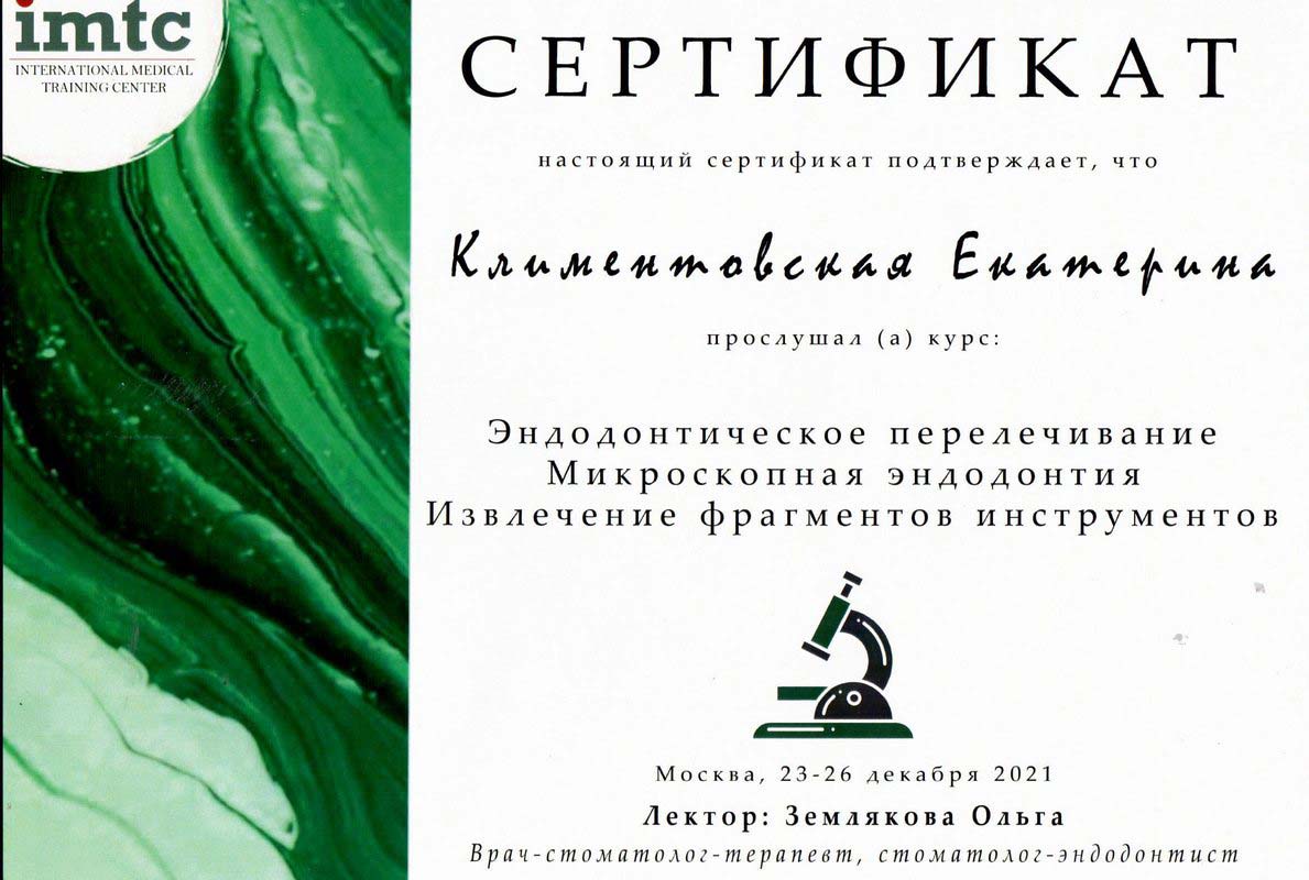 2019г. — Сертификат специалиста по специальности, «Стоматология терапевтическая», в ЧОУ ДПО «Институт повышения квалификации и современных технологий».