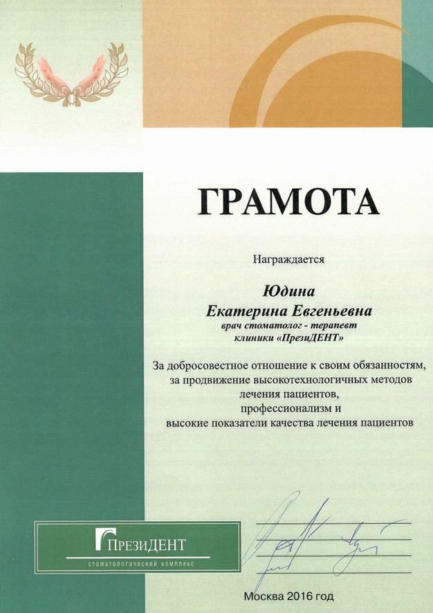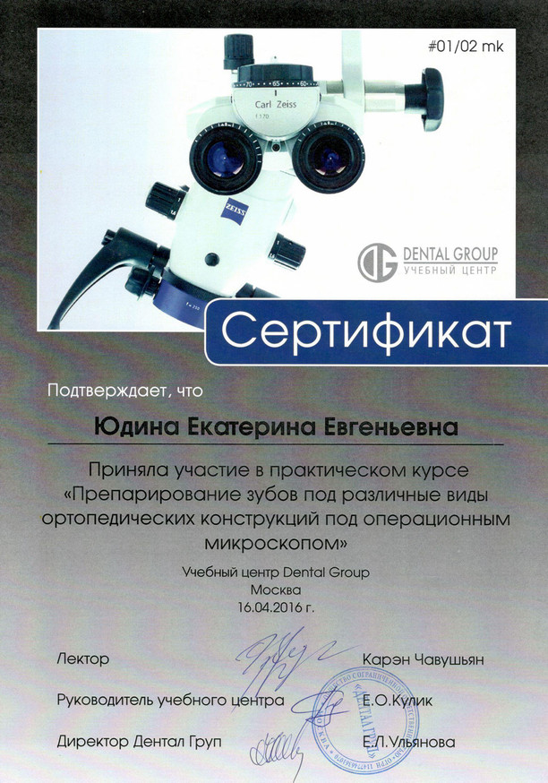 2016 г. — Учебный центр «Dental Group». Приняла участие в практическом курсе «Препарирование зубов под различные виды ортопедических конструкций под операционным микроскопом». Лектор Карэн Чавушьян