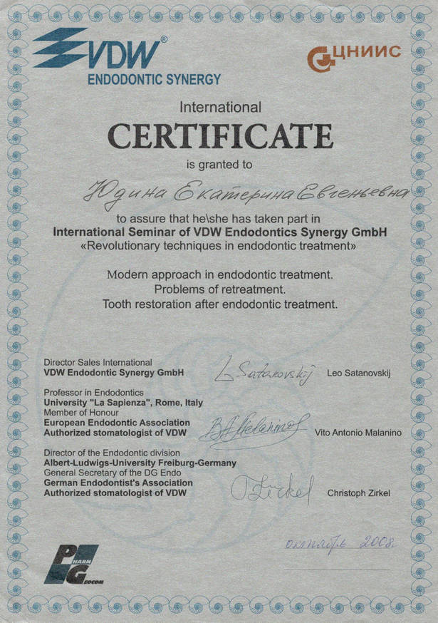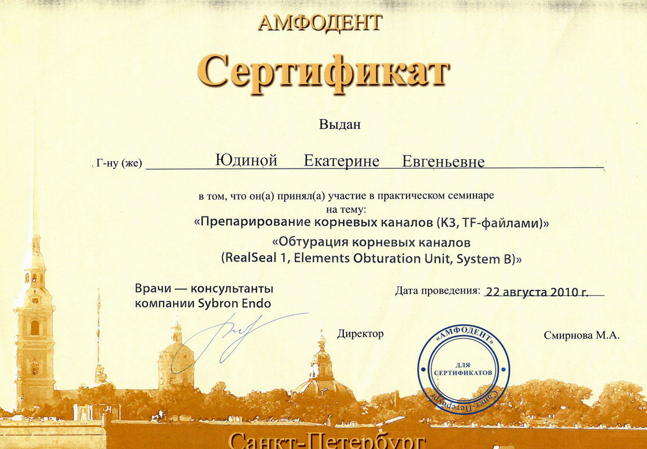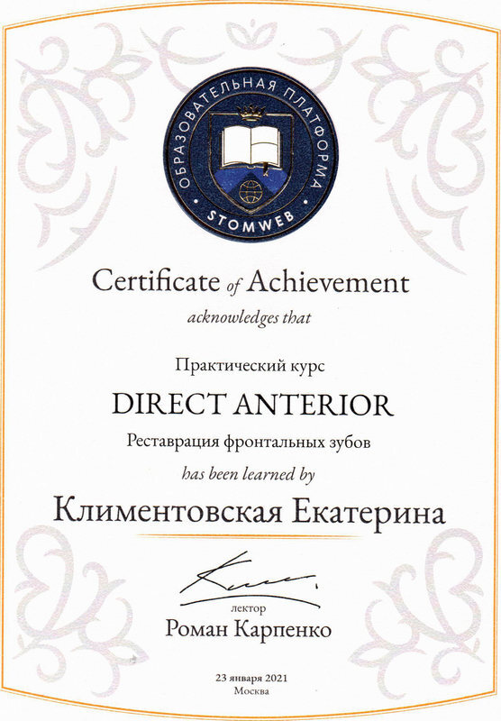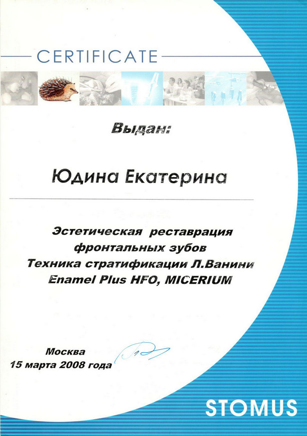 2012 г. — сертификат «Icon Infiltration Concept» (Icon — инновационная методика лечения кариеса зубов без препарирования), Учебно—методический центр Валлекс М.