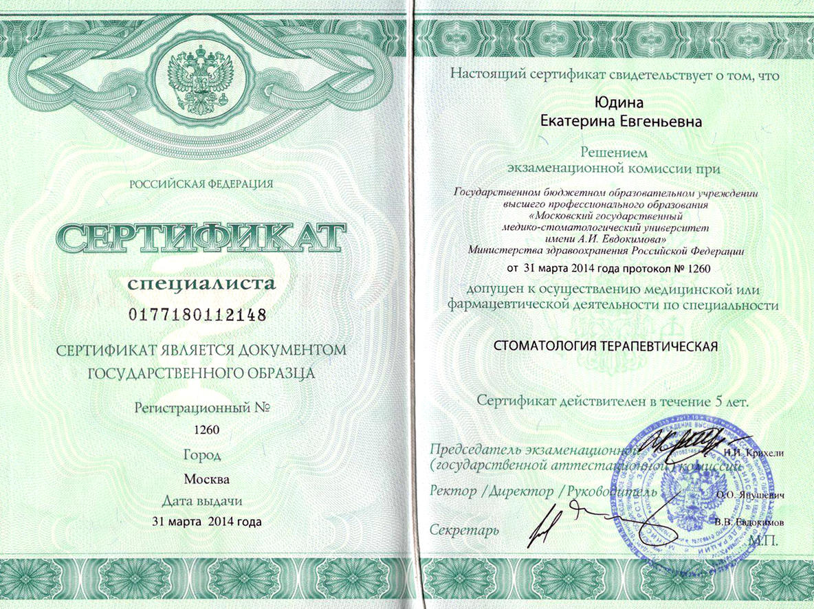 2014г. — Удостоверение о повышении квалификации по специальности «Стоматология терапевтическая», в Московском государственном медико—стоматологическом университете А.И. Евдокимова;