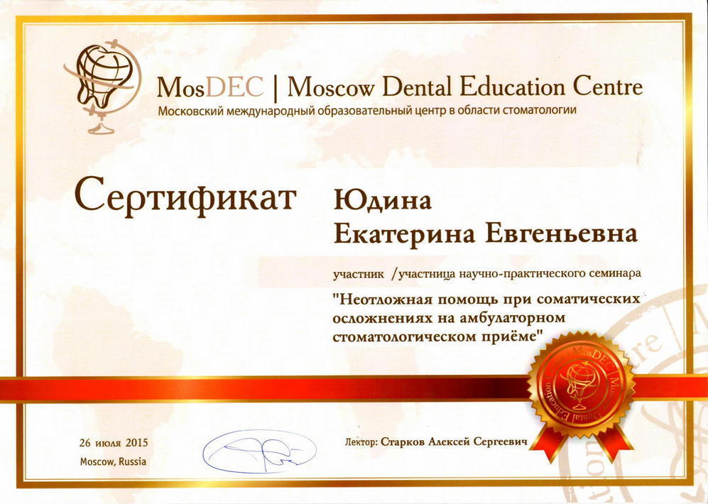 2015 г. — MosDEC/Moscow Dental Education Centre (Московский международный образовательный центр в области стоматологии. Участница научно—практического семинара «Неотложная помощь при соматических осложнениях на амбулаторном стоматологическом приёме». Лектор Старков Алексей Сергеевич