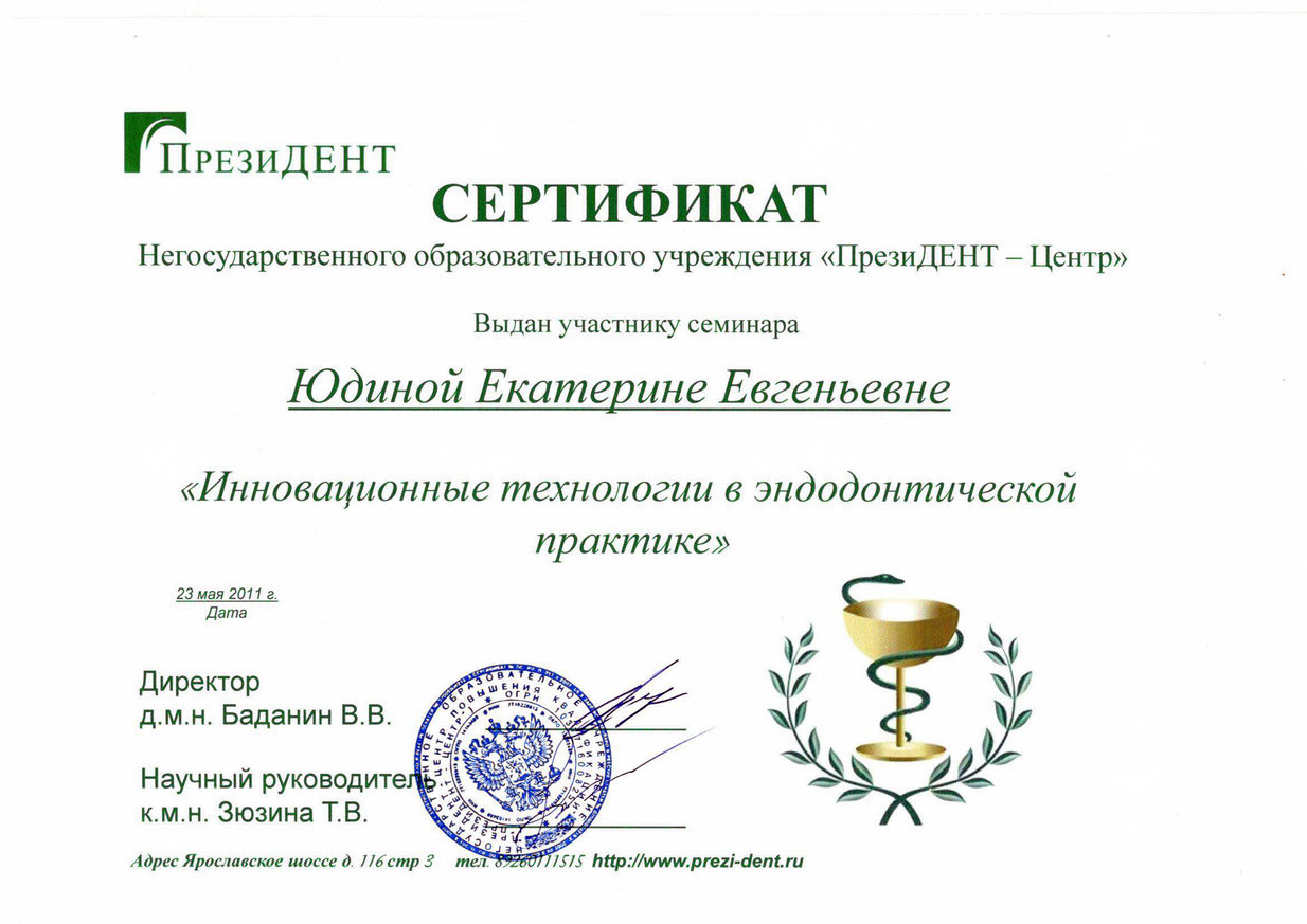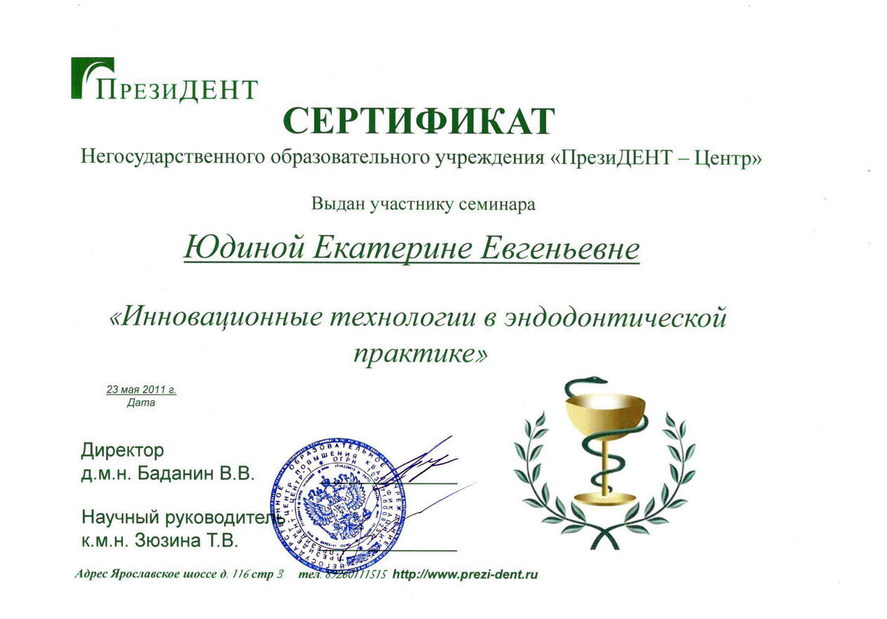 2011 г. — Инновационные технологии в эндодонтической практике, Москва (К.М.Н. Зюзина Т.В.)