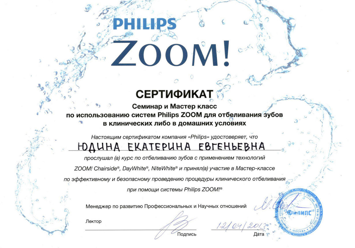 2013 г. — курс по отбеливанию зубов по технологиям Discus Dental, Day White, Nite White, Zoom. Эффективность и безопасность этой процедуры