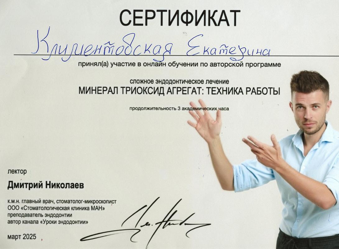 2014г. — Сертификат специалиста по специальности, «Стоматология терапевтическая», в Московском государственном медико—стоматологическом университете А.И. Евдокимова;