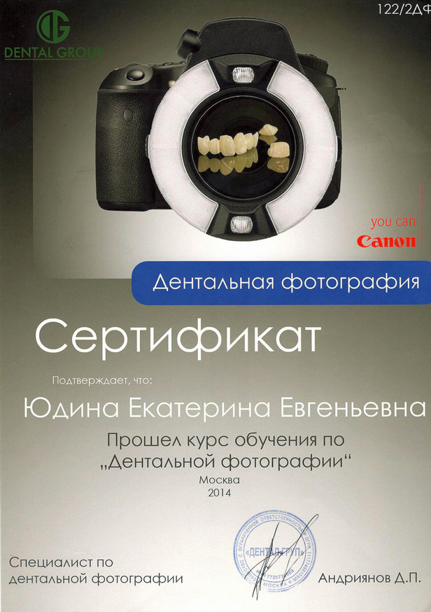 2014 г. — Прошла курс обучения по «Дентальной фотографии» у Андриянова Д.П.