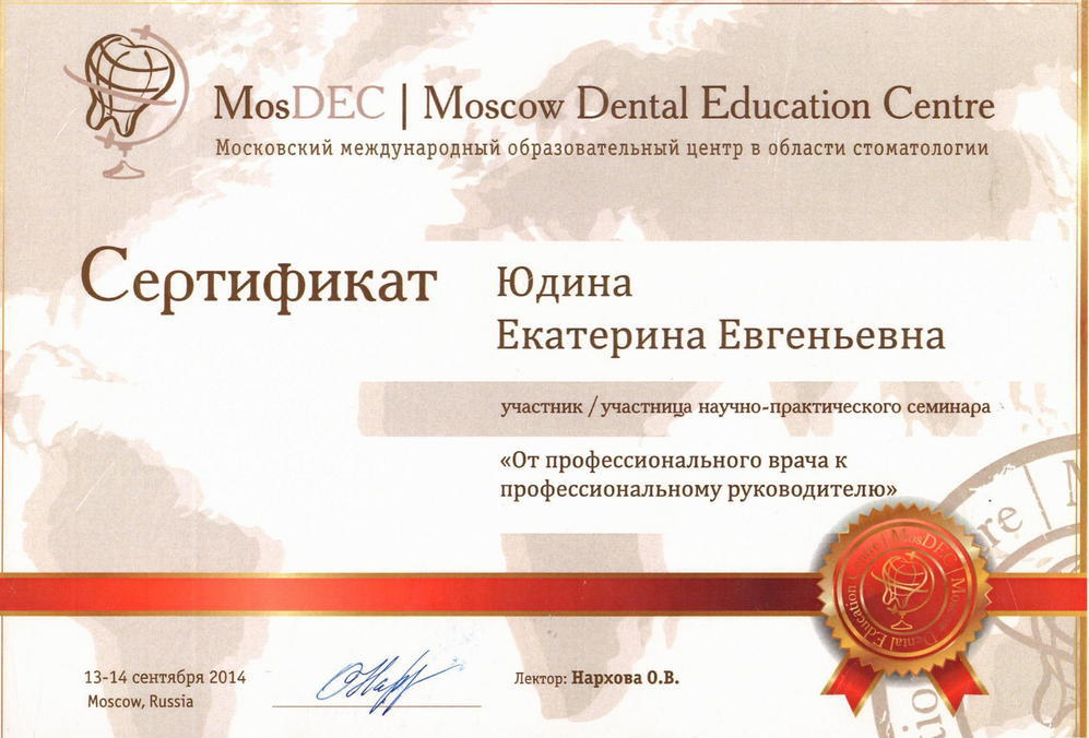 2014 г. — MosDEC/Moscow Dental Education Centre (Московский международный образовательный центр в области стоматологии. Участница научно—практического семинара «От профессионального врача к профессиональному руководителю». Лектор Нархова О.В.