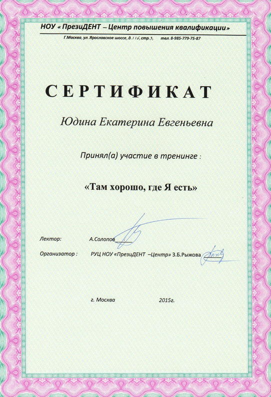2014 г. — «НОУ ПрезиДЕНТ—Центр повышения квалификации». Приняла участие в тренинге: «Там хорошо, где Я есть». Ректор Солопов А.