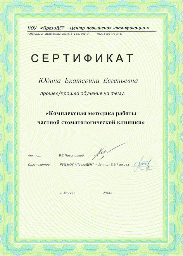2014 г. — «НОУ ПрезиДЕНТ—Центр повышения квалификации». Прошла обучение на тему: «Комплексная методика работы частной стоматологической клиники».