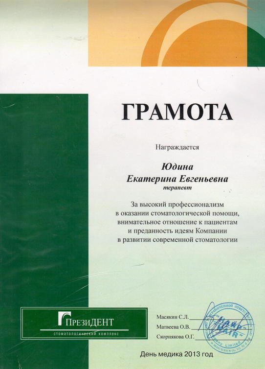 2013 г. — награждена грамотой «За высокий профессионализм в оказании стоматологической помощи, внимательное отношение к пациентам и преданность идеям Компании в развитии современной стоматологии»