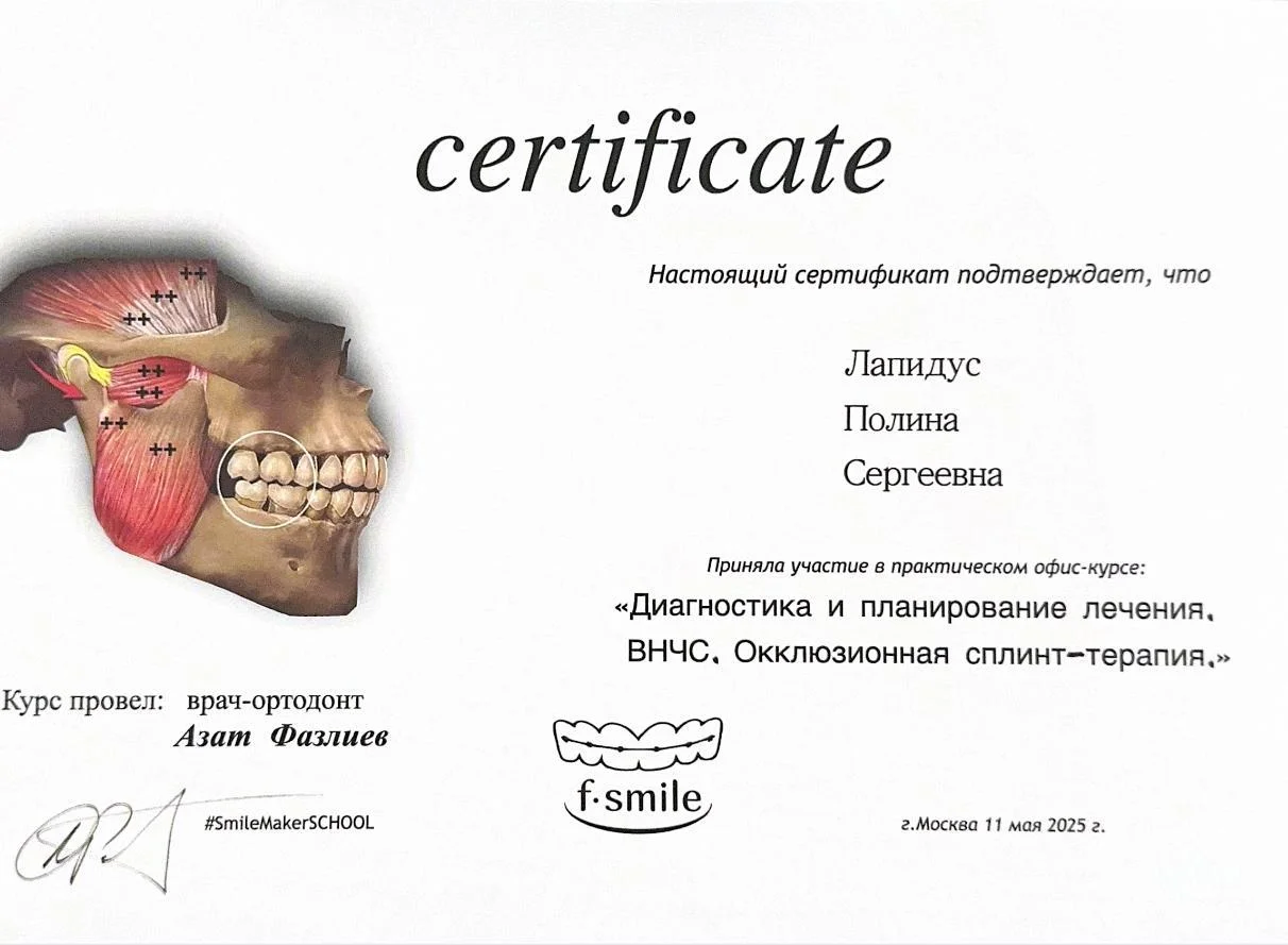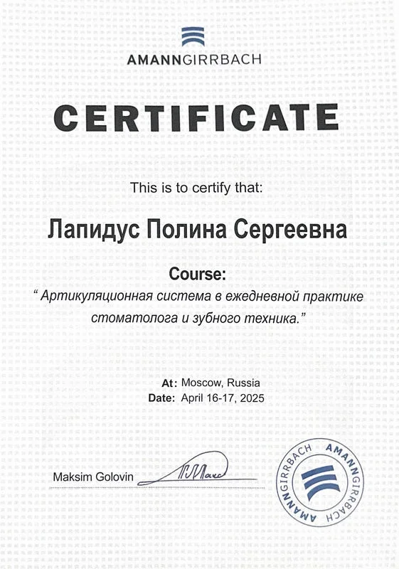 - 2022г. — Ординатура. ФГБОУ ВО «Российский университет медицины» Министерства здравоохранения Российской Федерации г.Москва. Специальность: Врач стоматолог-ортодонт