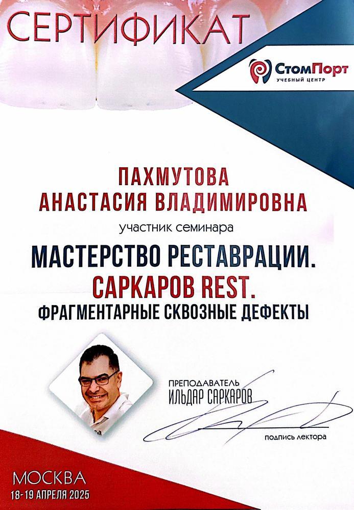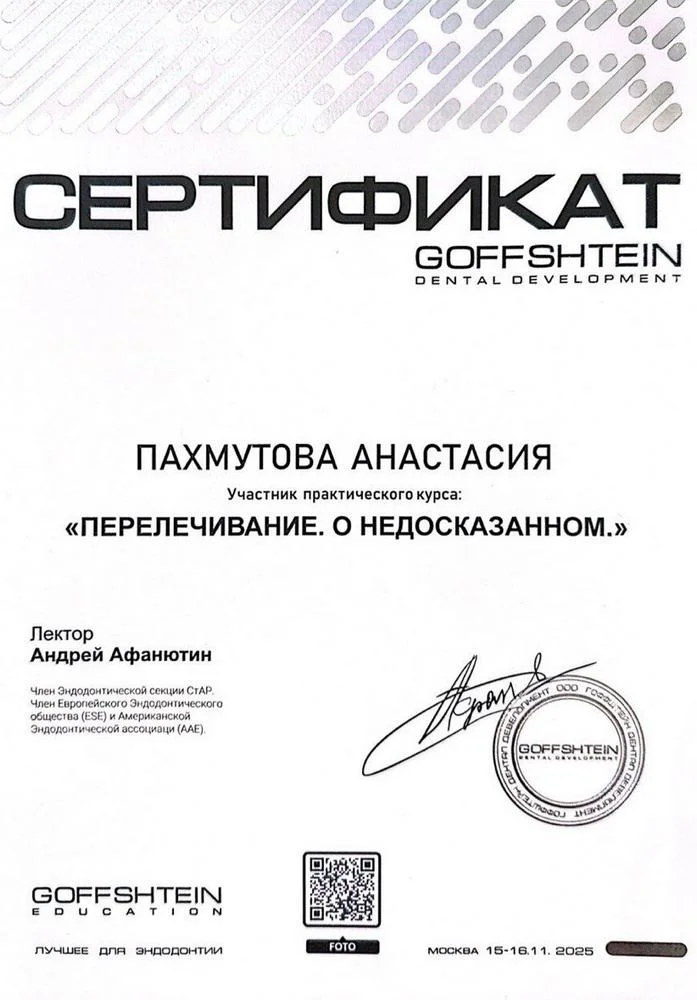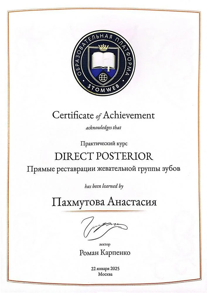 2024г. — прошла профессиональную переподготовку в Чувашский государственный университет им. И.Н. Ульянова с присвоением специальности врача стоматолога по направлению терапевтическая стоматология