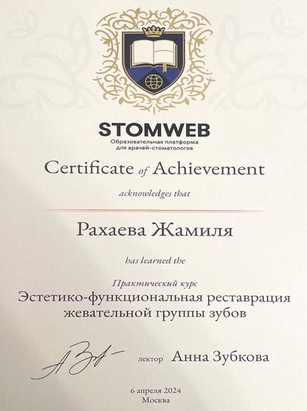 2024г. — Практический курс — «Эстетико- функциональная реставрация жевательной группы зубов» Лектор- Анна Зубкова. Учебная платформа STOMWEB г.Москва.