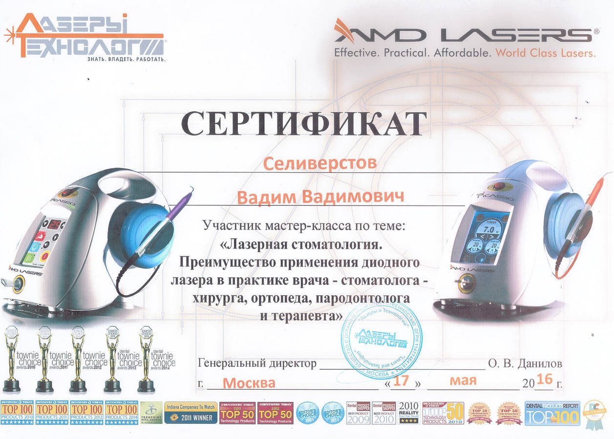 2016 г. — «Лазерная стоматология. Преимущество применения диодного лазера в практике врача-стоматолога- хирург, терапевта, пародонтолога и ортопеда» AMD Lazers