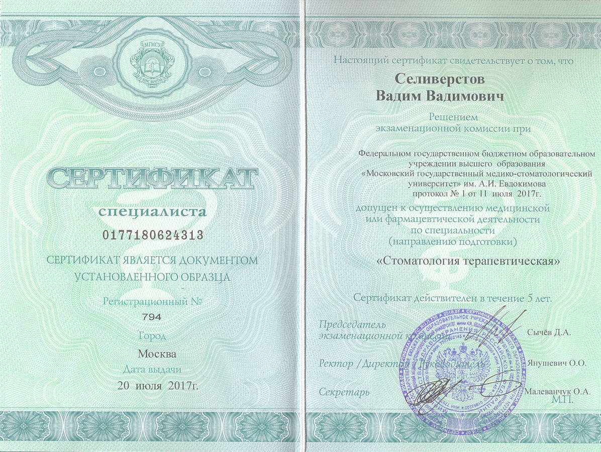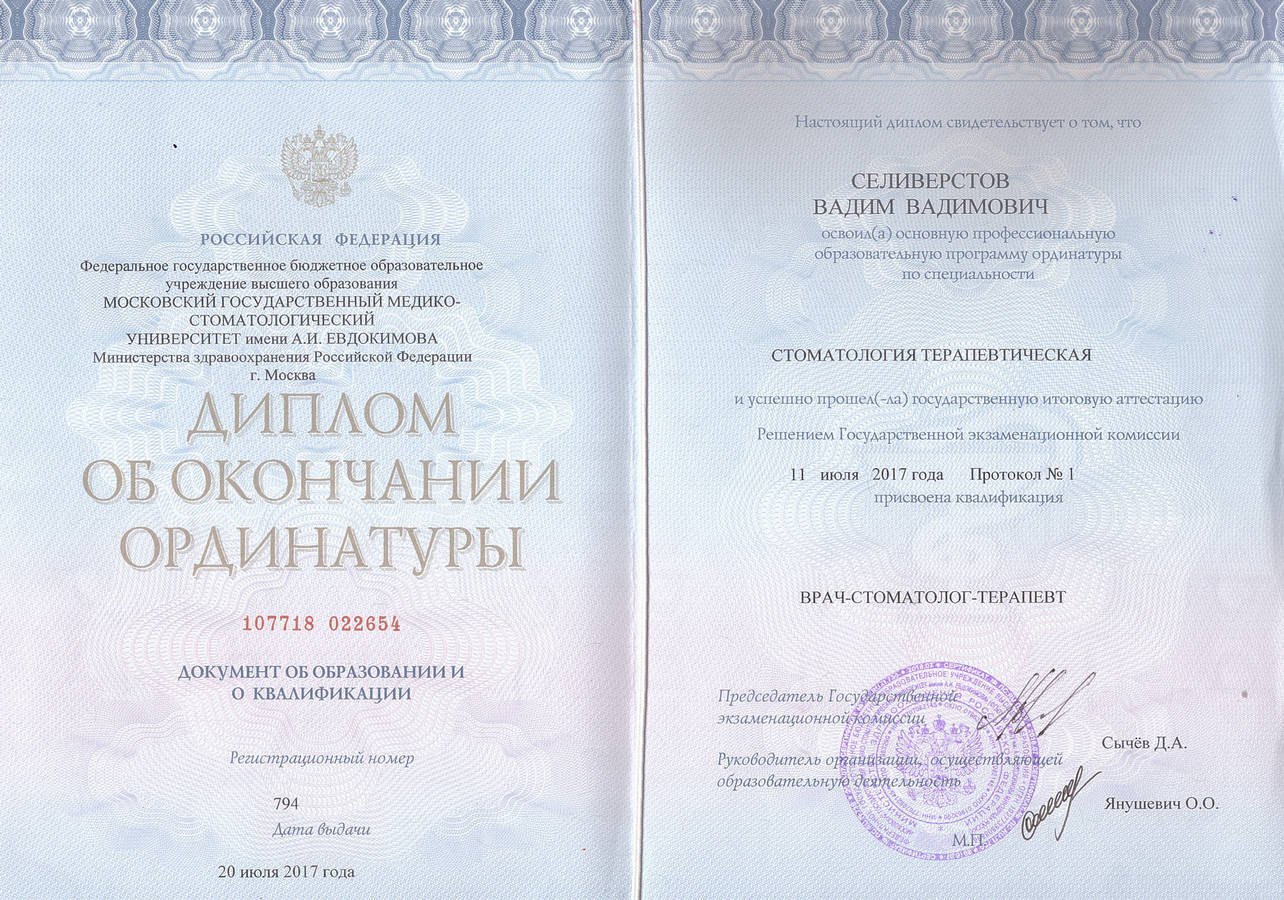 2017г. — Ординатура, Московский государственный медико- стоматологический университет Евдокимова (стоматология терапевтическая)